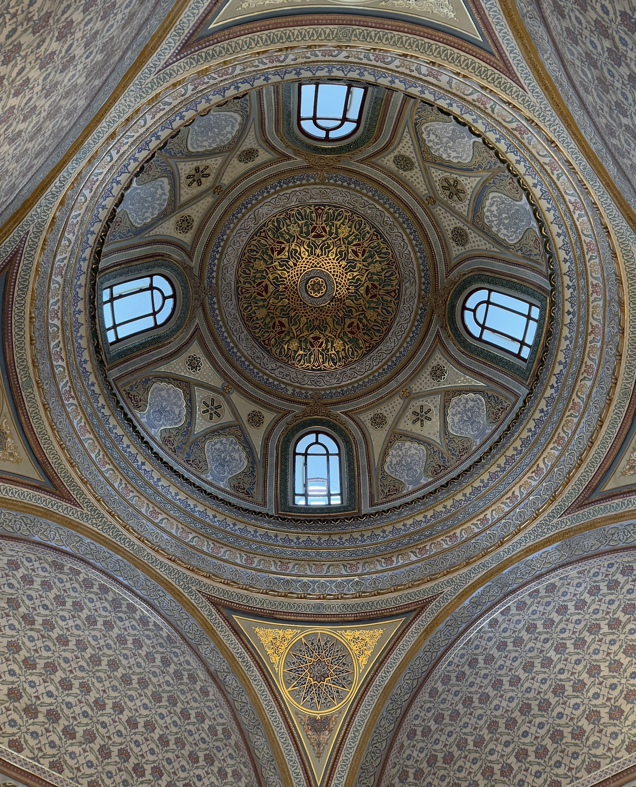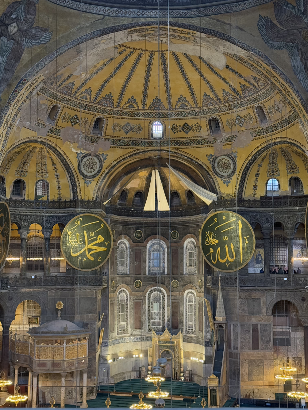 성 소피아 성당의 성화를 가리기 위해 회색깔의 석회 반죽을 칠했다. 2층 내부의 벽 곳곳에는 회색으로 벽을 덮은 흔적들을 확인할 수 있다. 1층에는 알라와 무함마드를 찬양하는 아랍어가 쓰여있고, 이슬람교의 제단들이 보인다.