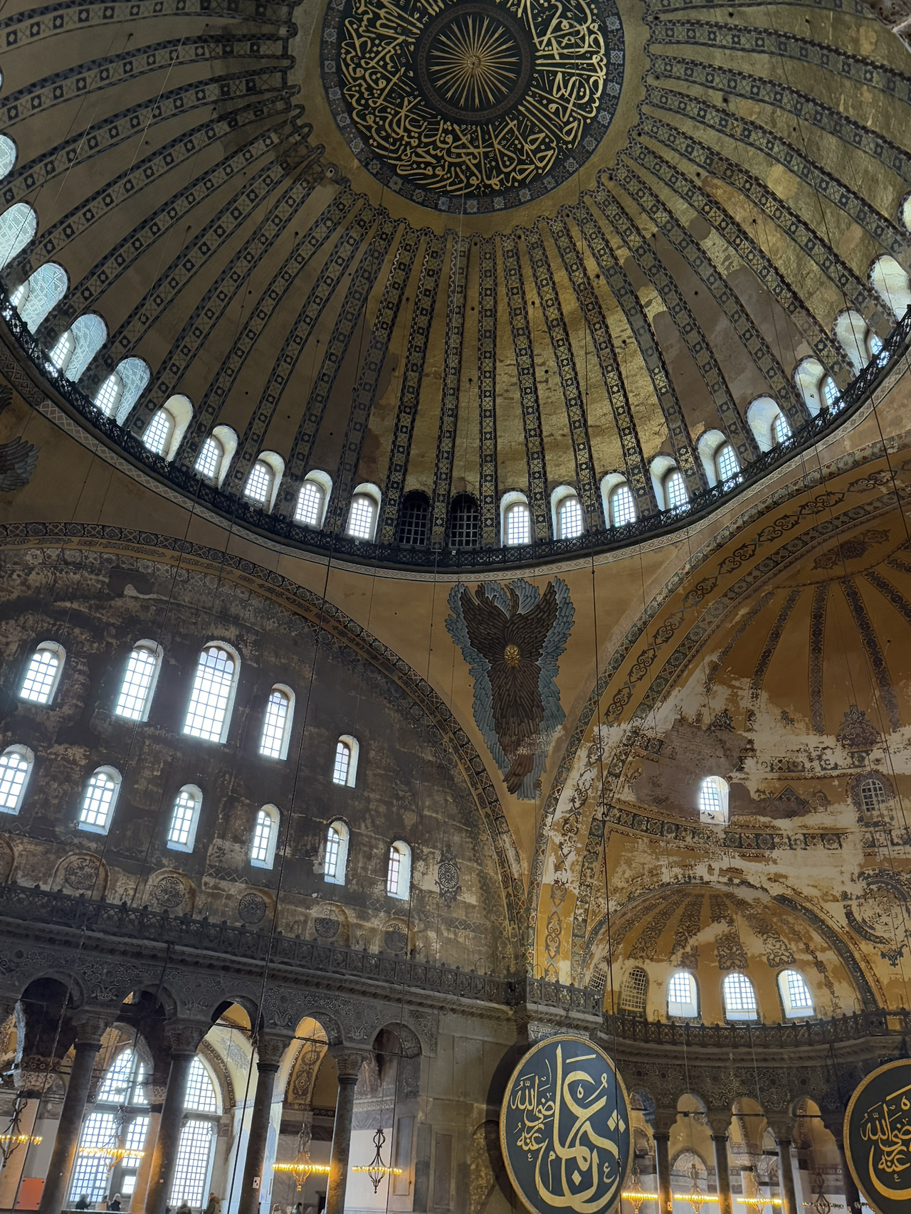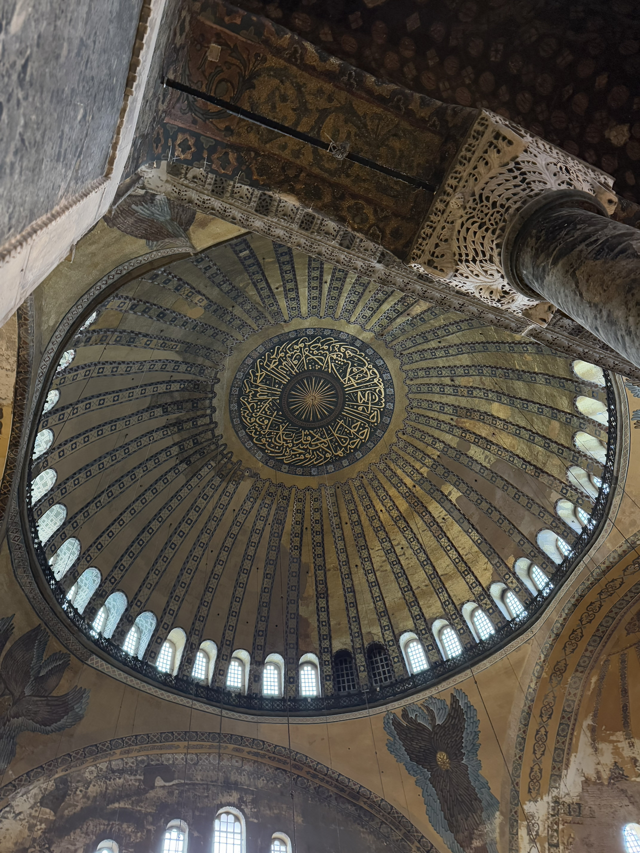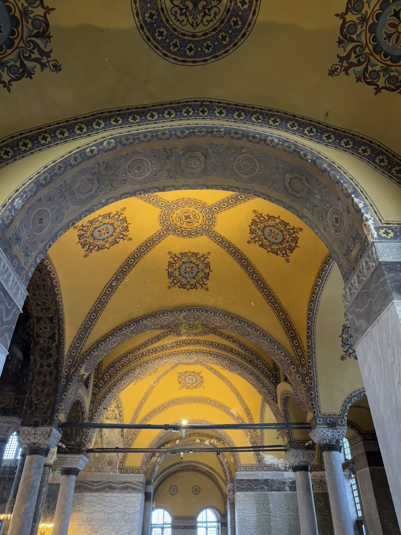 아야 소피아(Aya Sofia) 는 537년 동로마 제국의 유스티니아누스 1세 황제에 의해 만들어진 성당이었다. 성 소피아 성당이라고도 불린다. 동로마 제국은 유스티니아누스 황제가 사망하자 점점 쇠퇴했지만, 1453년 오스만투르크의 등장까지 900년 넘게 명맥을 이어갔다. 그러다 15세기, 튀르키예 땅은 오스만 제국이 차지한다. 그리고 성 소피아 성당은 이슬람 예배당인 모스크로 바뀌었다. 튀르키예어로 모스크를 자미(Cami) 라고 부른다. 현재는 아야 소피아 자미로 불리며, 애잔한 역사의 흔적을 간직한 장소로 남아 있다.