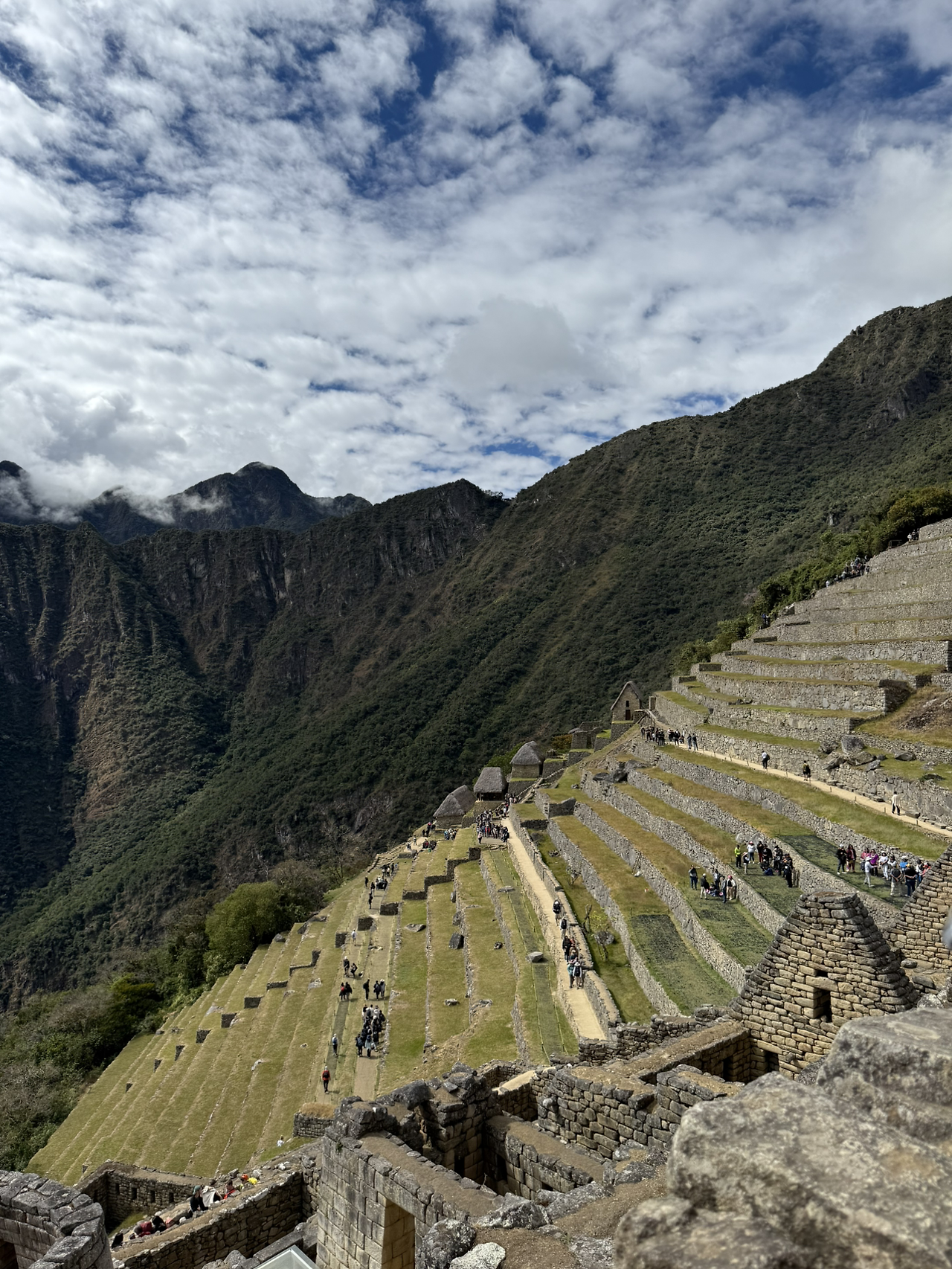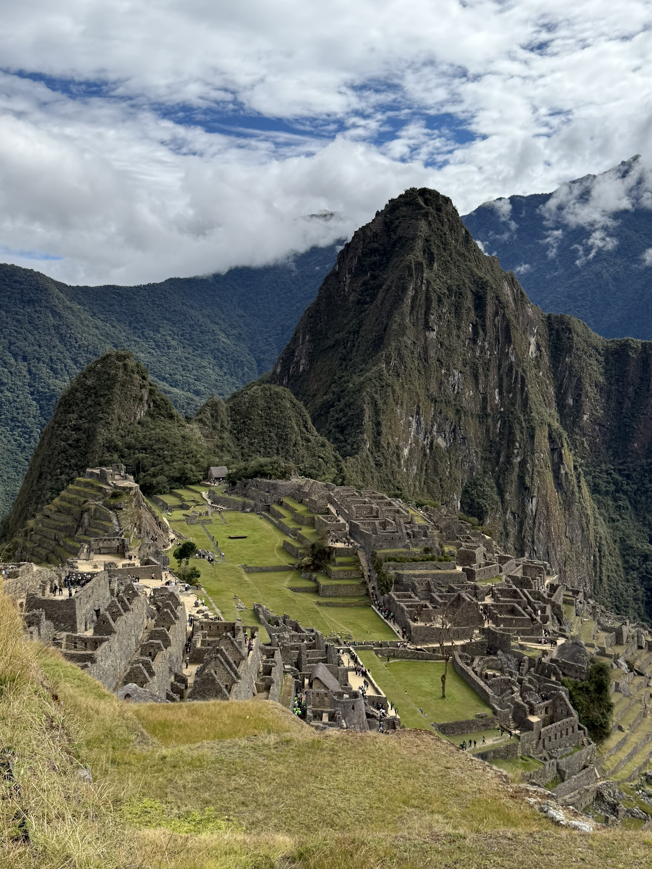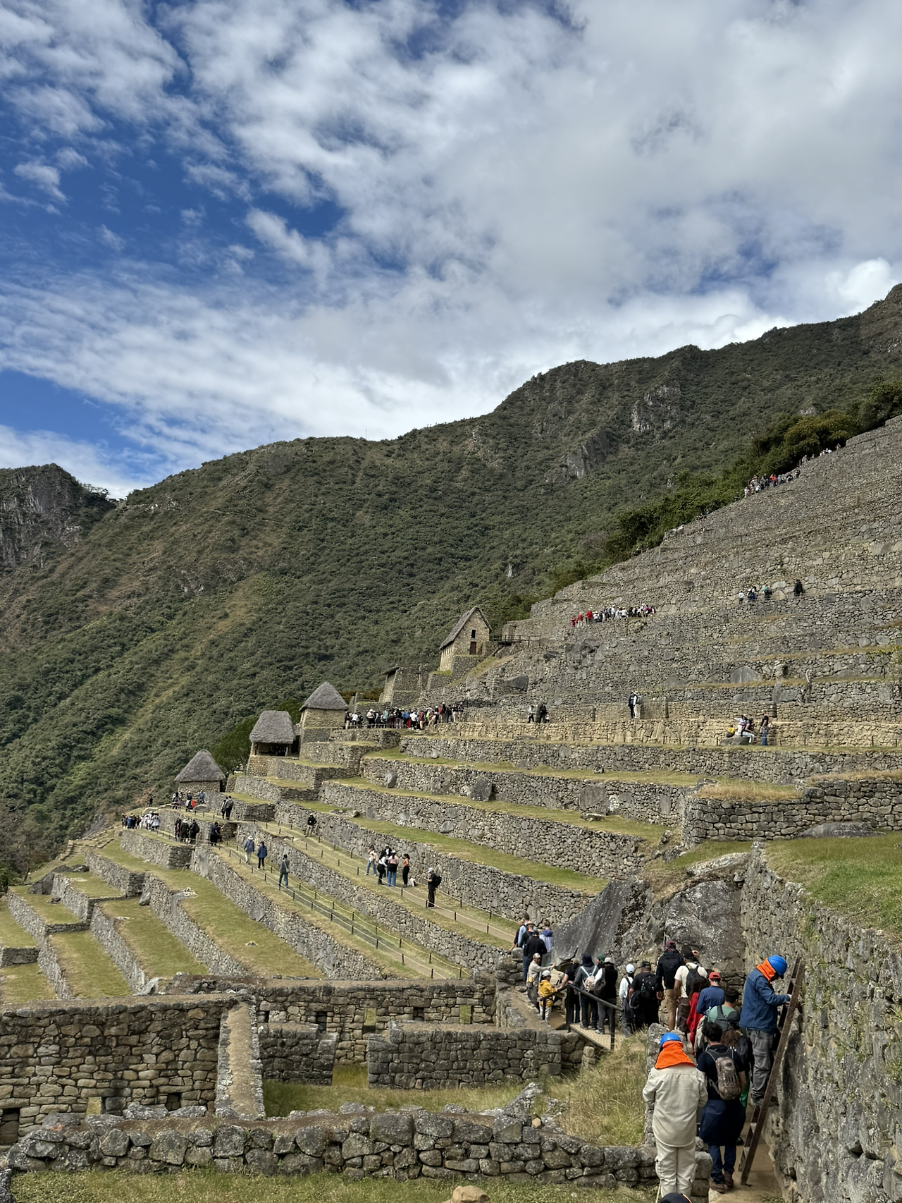 마추픽추 사진을 양껏 찍고 이제 계단을 올라 망지기 집으로 향했다. 망지기 집은 마추픽추를 관리하기 위해 있던 곳이며 도시 전경을 한눈에 내려다볼 수 있는 전망대 역할을 했다. 지금은 아마 마추픽추의 가장 전망 좋은 곳이 된 것 같다. 망지기 집에 도착하자 평원처럼 넓은 잔디가 있었다. 사람들이 삼삼오오 모여 잔디 위에 앉아 쉬고 있었다. 돌로 만들어진 거대 도시의 전경과 산세가 어우러진 장관이 한눈에 들어왔다.