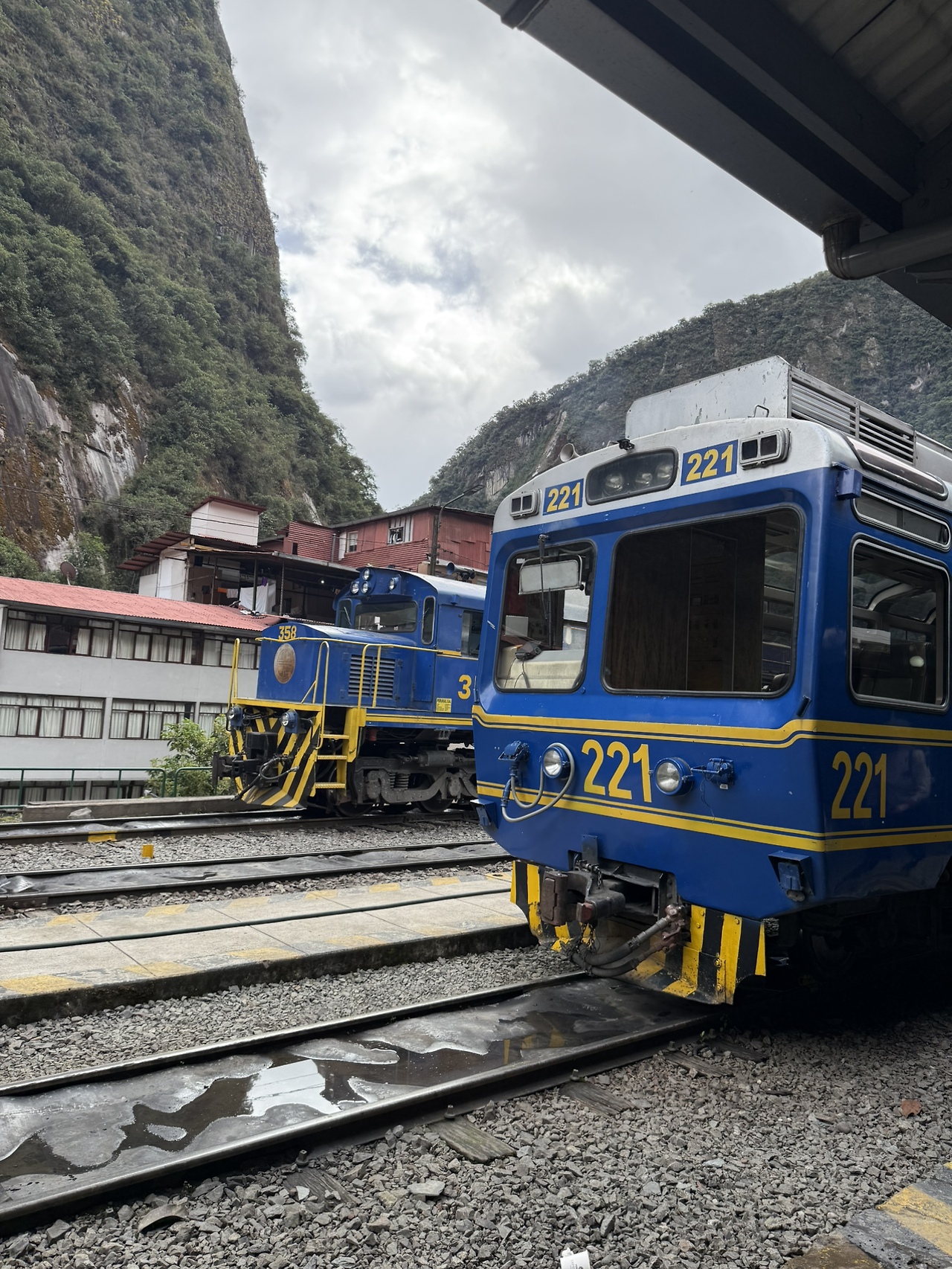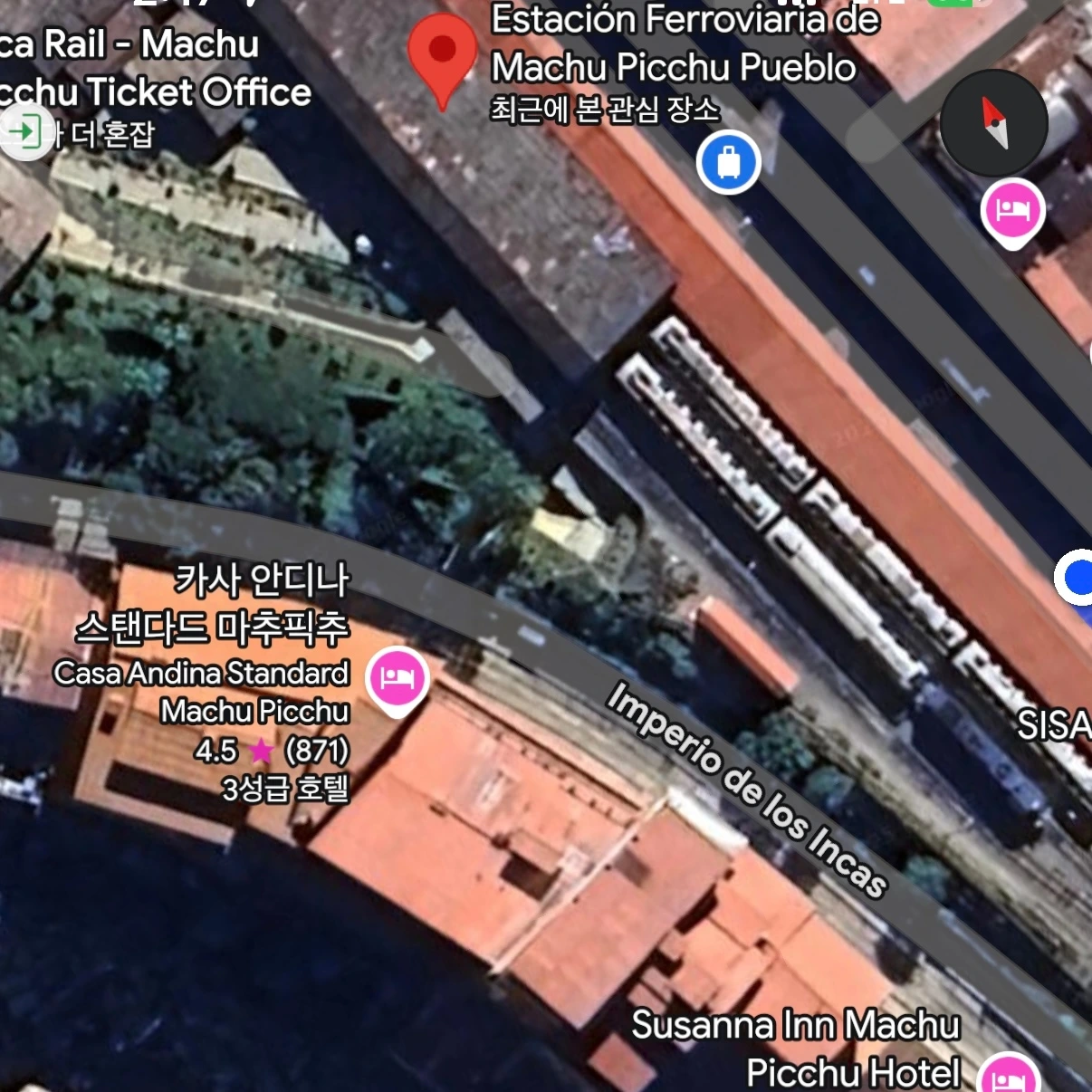 이제 쿠스코로 다시 떠날 시간이 되었다. 기차를 타기 위해 기차역을 찾아 가는데 내렸던 기억에만 의존해 걸어가 보니 기차역의 대합실이 안 나왔다. 분명 내렸던 건 이쪽이 맞는 거 같은데? 이상하다 싶어 주변을 살펴보니, 저 위쪽에 기차역으로 보이는 건물이 보였다. 아구아스깔리엔떼스에서 쿠스코로 가는 기차를 타려면 구글 지도에 기차역(Estación Ferroviaria de Machu Picchu Pueblo) 을 이렇게 찍으면 된다.