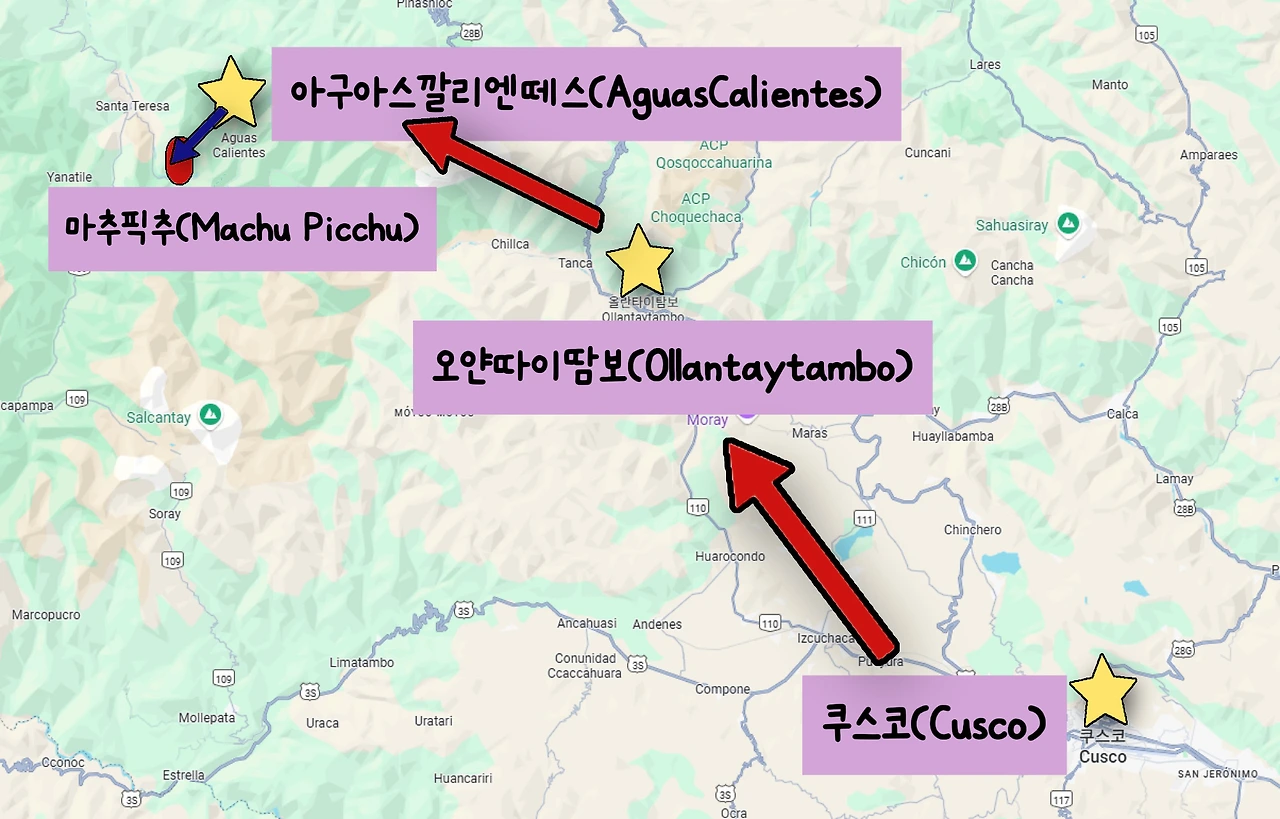 페루에서 마추픽추(Machu Picchu)를 가려면 많은 이동이 필요하다. 보통 마추픽추를 가려면 페루 쿠스코(Cusco) 도시로 가야 하고, 쿠스코로부터 북쪽으로 이동해야 한다. 쿠스코에서 마추픽추까지 한 번에 갈 수 있는 방법은 없고 버스와 기차를 환승해야 한다.