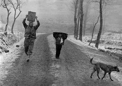 "개는 화면의 빈 자리를 채워주고, 한 쪽의 몸피 큰 아낙, 그리고 다른 쪽의 검은 등허리를 지닌 나무들과 균형을 이루어 구도를 안정시키기만 하는 것이 아니라 사진의 주제를 간섭하고 마침내 겨울 풍경의 '정신'을 바꾼다...이 겨울의 개는 우리가흔히 예술이라고 부르는 것의 정신이다."(황현산, 밤이 선생이다)