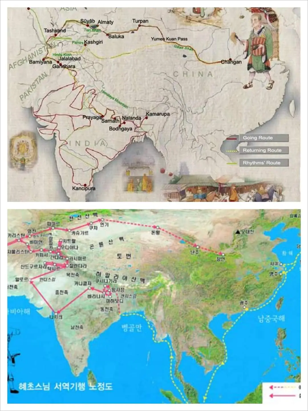 2. 아랫것 : 혜초의 여정(예상로 점선, 실제 여정 빨간 색)