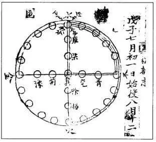 外圓象天, 內方象地. / 居中者爲樞星, 旁列者爲二十八宿.
