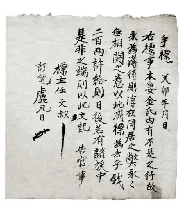 "오른쪽 수표의 일을 말할 것 같으면, 본처 김씨 아내에 부족한 행실이 있어, (내가 그녀를) 영영 박대한다면 같이 사는 데 폐단이 있을 것이니, 영원히 상관하지 않는다는 뜻에서 이 수표를 작성하고 돈 200냥을 주기로 한다. 차후에 만일 여러 친족들이 이 문제로 다시 시비를 벌인다면, 이 문서로 관청에 고한다."(手標는 돈이나 물품 따위를 꾸거나 꾸어 줄 때 또는 맡길 때에 주고받는 증서)