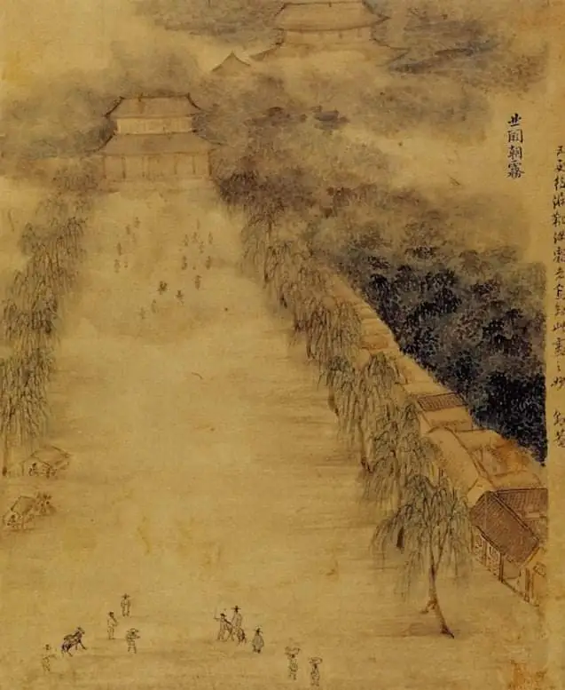 그런데 저 거리는 광화문 대로가 아니라 창덕궁 앞 거리를 그린 것이다. ‘북궐(北闕)’이라는 말 때문에 그런 오해를 일으킨 모양이다. ‘북궐’은 ‘동궐’과 ‘서궐’에 대하여 말할 때 경복궁이 되는 것이지, 그렇지 않을 때는 대개 ‘임금이 사는 궁궐’을 지칭한다. 그래서 ‘남면(南面)’이란 말이 성립한다. ‘남면’은 임금의 자리에 오르거나 임금이 되어 나라를 다스린다는 말이다. (당연히 ‘북면(北面)한 신하’라는 말이 성립함)