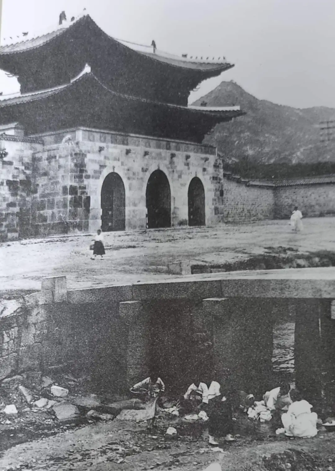 이러한 추정이 가능케 한 사진을 발견했다. 조선총독부가 세워지면서 광화문은 잠시 옆으로 옮겨지는데, 그곳이 바로 현재의 민속박물관 자리다. 광화문은 1925년 7월부터 1926년 9월까지 그 자리로 '피신'해 있었던 것이다. <사진 1>에서 바로 그 모습을 볼 수 있다. 그런데 그 앞에 다리가 하나 있고, 그 아래에서 아낙네들이 빨래를 하고 있는 장면이 찍혔다.