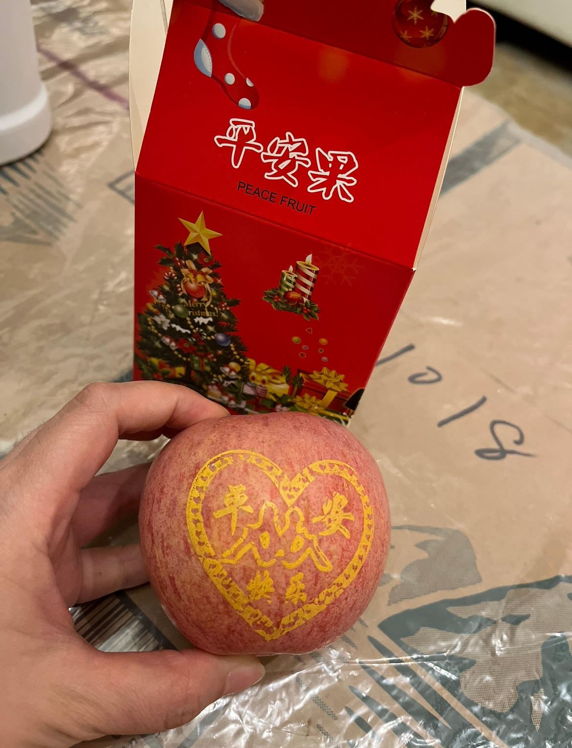 크리스마스 봉투에 이쁘게 포장을 한 사과를 받았다. 사과 겉면엔 금색으로 복(福)이라는 글씨도 쓰여 있었다. 핑안예, 메리 크리스마스 하면서 이브에 나눠 줬던 사과를 잊지 못한다. 방호복을 입은 사람들이 사과를 나눠 주는데 너무 신기했었다. 크리스마스에 케이크도 아니고 사과를 선물 받다니.