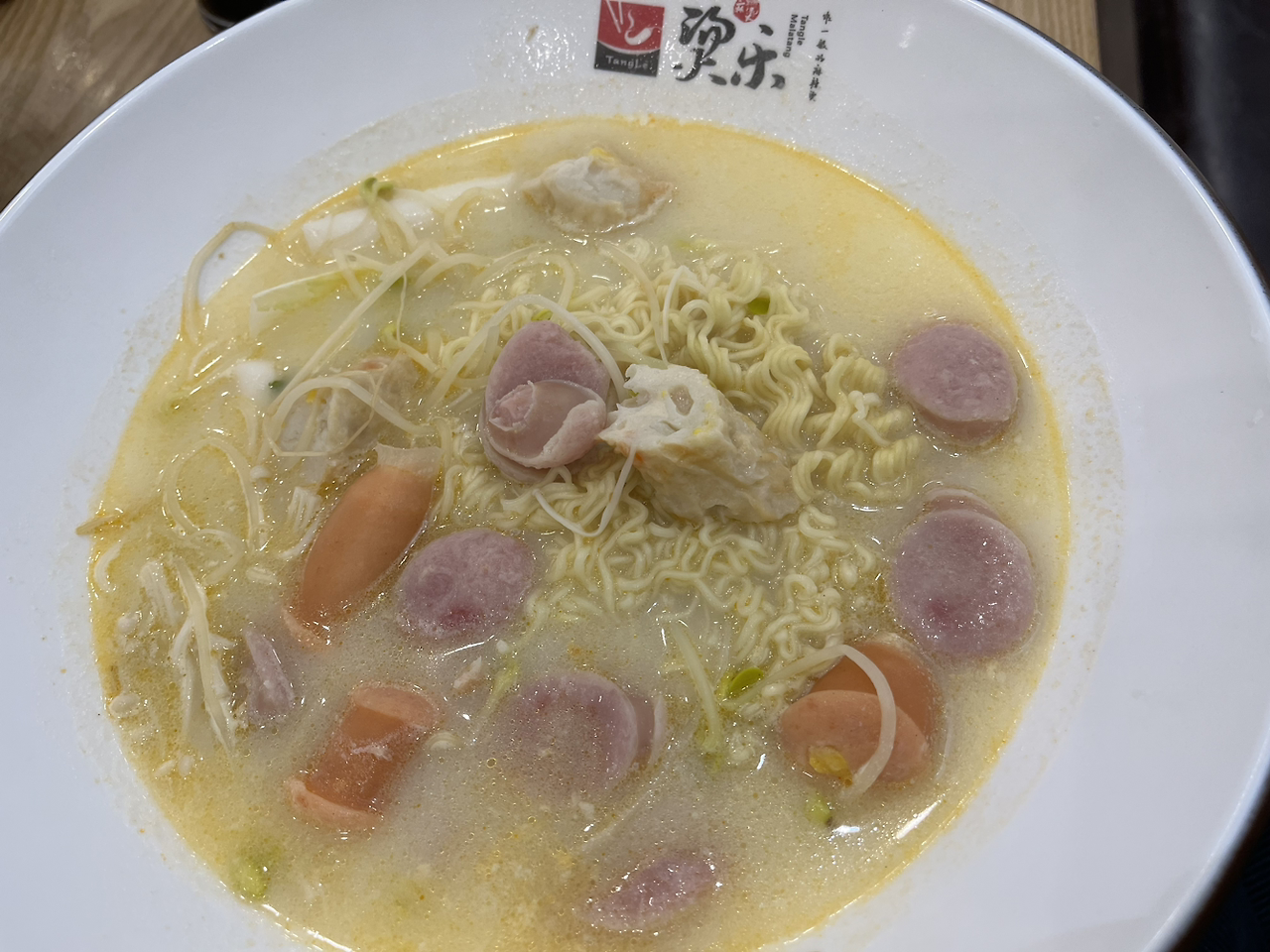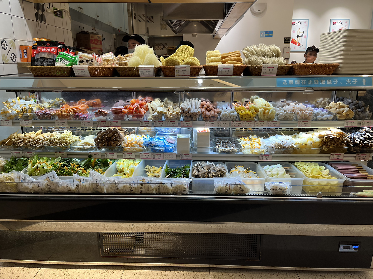 접시를 들고 마라탕에 넣고 싶은 재료를 고르면 된다. 각종 버섯과 콩나물, 알배추, 감자, 연근 등 채소들이 있다. 고기도 추가할 수 있고 어묵과 소시지, 새우볼 등도 인기가 많다. 특이하게 선지도 있다. (한국 마라탕집을 가보지 못해서 아쉽다)