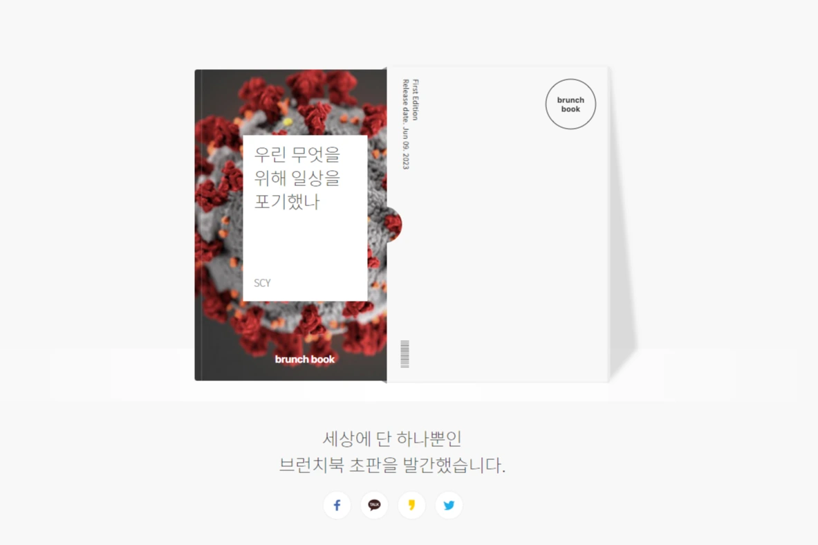 원래는 작년 브런치북 공모 시기에 유사한 주제로 브런치북을 생성하여 제출을 했으나, 아직 방역이 한창 진행 중이었던지라 완성도 측면에서 부족함이 있다고 판단하여 이를 폐기하고 한동안 글을 올리는 것에만 집중했습니다. 다행인지 불행인지 실내 마스크 의무화 조치가 대부분 해제되며 방역은 마무리 수순에 들어갔고, 그 덕분이라 해야 할진 모르겠지만 글의 서론과 본론, 결론에 해당하는 부분을 구성할 수 있겠다는 판단이 들었고, 마침내 약 1년만에 브런치북을 재생성하였습니다. 그 제목은 바로 <우린 무엇을 위해 일상을 포기했나>입니다.