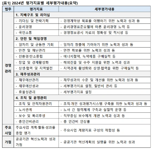 공기업‧준정부기관의 2024년도 경영실적은 법률 제4조 내지 제6조의 공공 기관 유형 구분 기준 및 산업별‧기능별‧규모별 유형 구분 기준에 따라 평가 유형을 구분하여 평가한다. 평가지표는 평가 대상 공공기관의 경영실적을 체계적이고 종합적으로 평가 할 수 있도록 ‘경영관리-주요사업’의 2개 범주로 구성되며, 평가지표는 평가목적과 대상범위를 규정하는 지표정의와 세부평가내용으로 구성한다