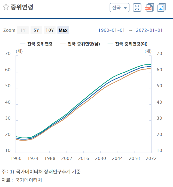 백문이 불여일견(百聞이 不如一見)이라는 말이 있다. 이는 백 번 듣는 것보다 한 번 직접 보는 것이 훨씬 더 확실하고 중요하다는 뜻으로 직접 경험하고 체험하는 것의 중요성을 강조하는 사자성어이다. 우리나라의 중위연령 그래프를 보자마자 이 사자성어가 떠올랐다.