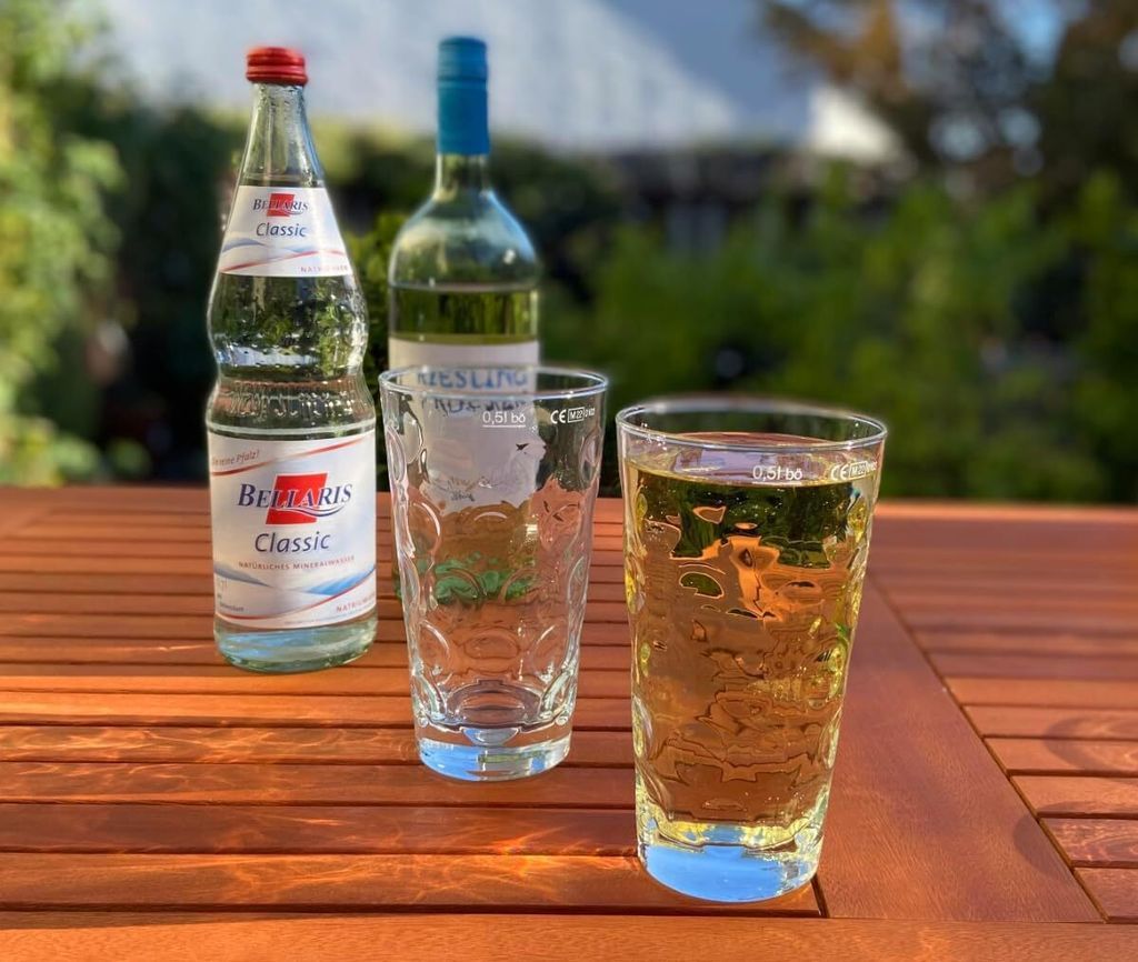 이번엔 독일의 남서 편, 대표적인 와인 산지인 라인헤센(Rheinhessen)과 팔츠(Pfalz) 지방의 시가지에 가보자. 이곳엔 파라솔이 펼쳐진 소박한 와인 바와 카페가 곳곳에 자리 잡고 있어. 테라스에 앉아 여유를 즐기는 사람들 손엔 빠짐없이 바인쇼를레(Weinschorle) 한 잔이 들려 있지. 드라이한 화이트 와인에 탄산수를 1:1로 섞은 음료야. 알코올 도수가 낮아 술처럼 느껴지지도 않고 갈증이 날 때 그냥 쭉쭉 넘어가지. 이 지역에서 주로 재배하는 리슬링, 뮐러-투르가우, 실바너 같은 청포도들을 이용해 만들어. 좋은 포도는 숙성용으로 남기고, 가벼운 것들은 쇼를레처럼 편하게 마시는데 쓰이지. 팔츠 지방에서는 두베글라스(Dubbeglas)라고 해서 겉에 동글동글 오목한 홈이 파여있는 유리잔에 따라줘. 비눗방울처럼 맑고 반짝이는 잔에 화이트 와인과 탄산수를 섞으면 연둣빛이 은은히 보기만 해도 시원하고 산뜻해진달까!