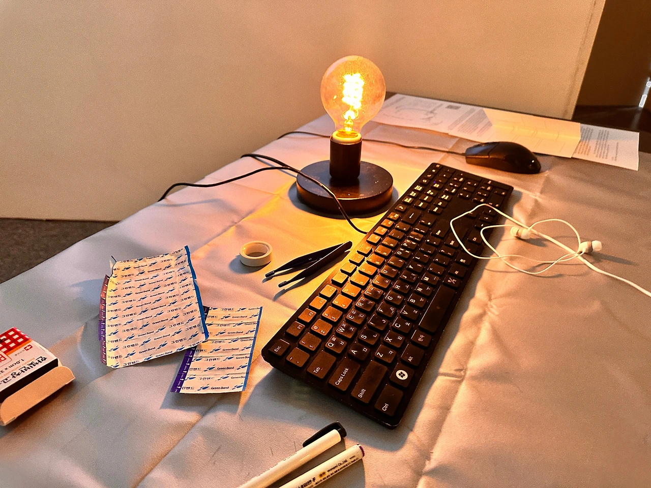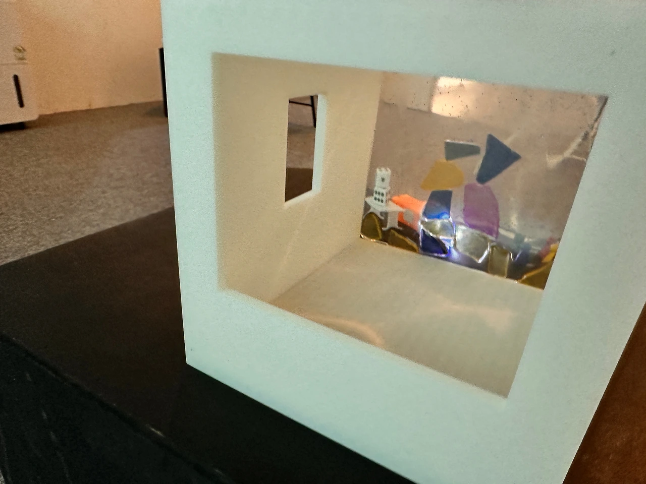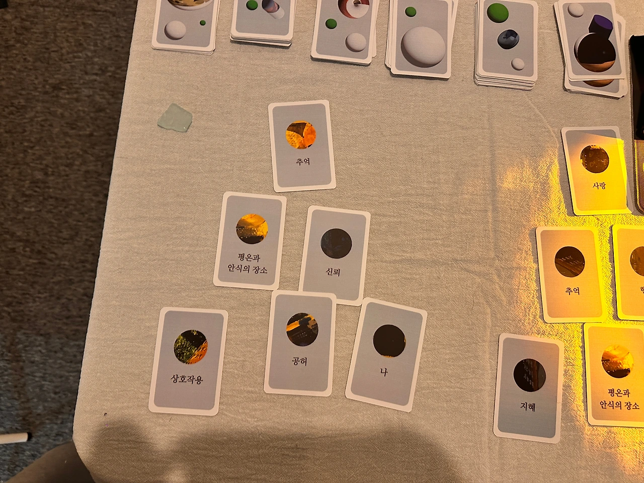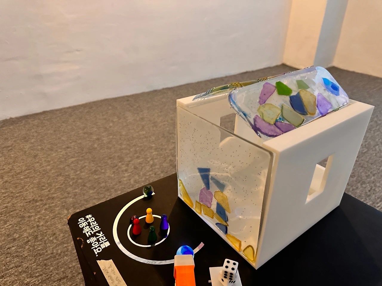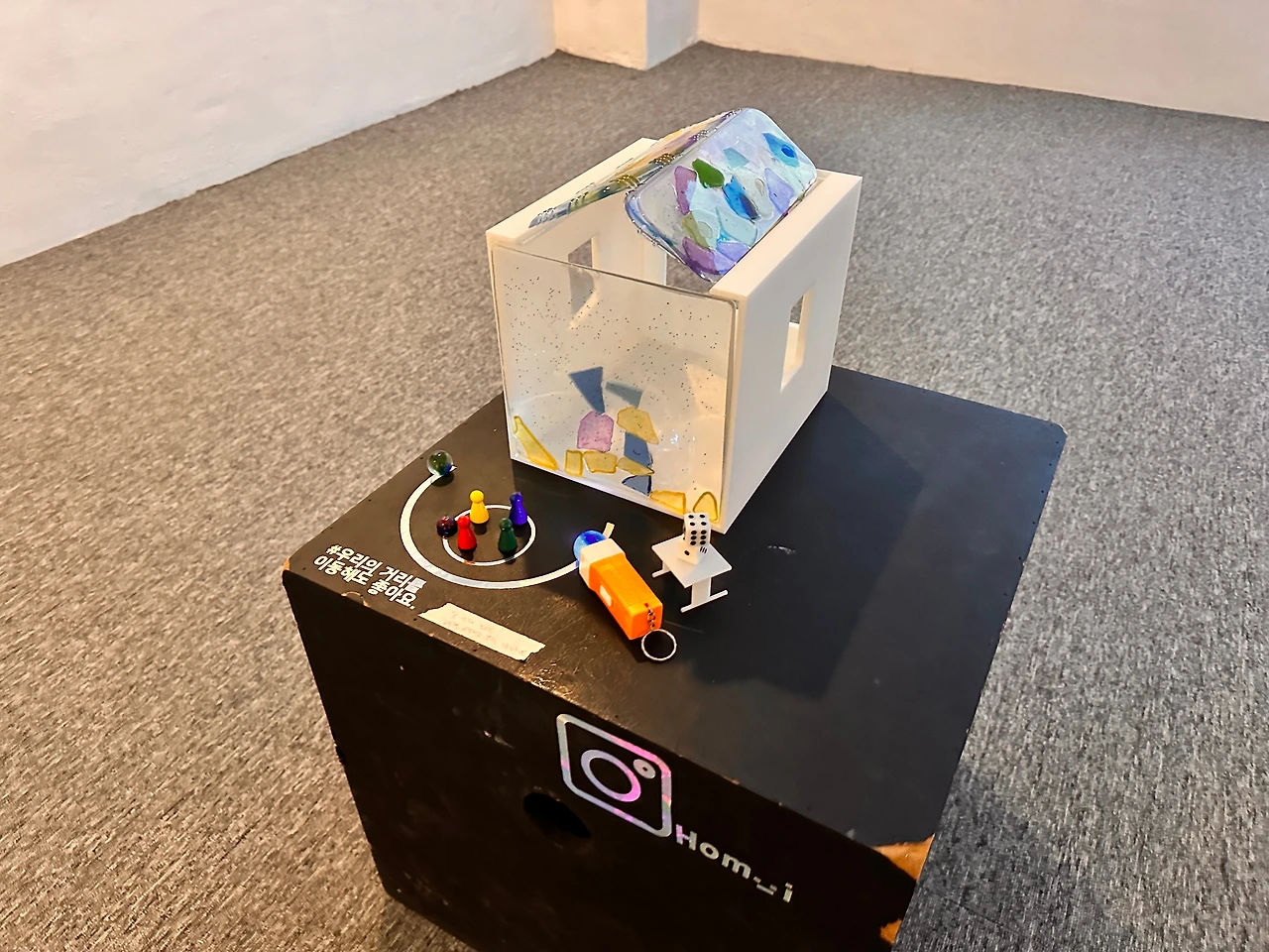 유리구슬과 유리 집으로 이루어진 설치 작품으로 참여자는 유리구슬과 오브제를 직접 만지고 배치할 수 있습니다. 관람객이 보고 있는 배치 또한 전 관람객이 생각하고 있는 인물 간의 거리입니다.