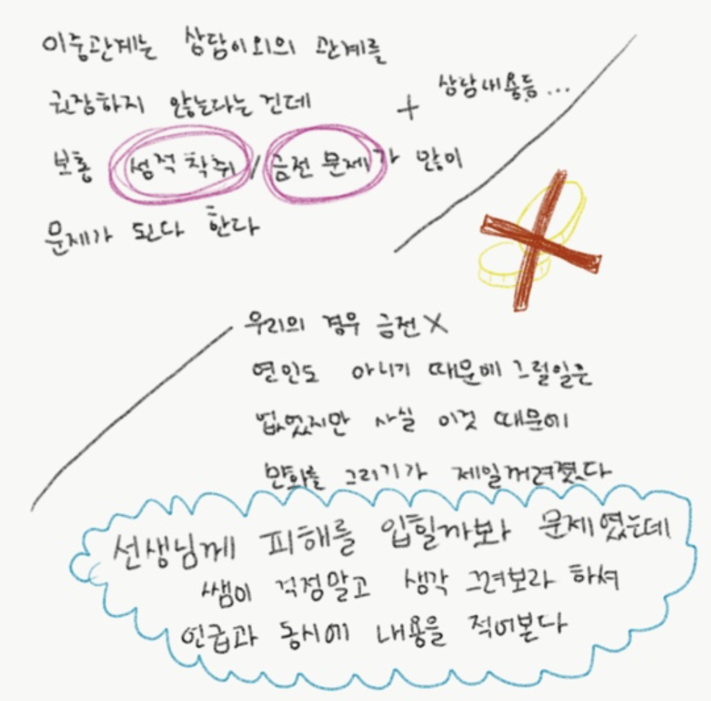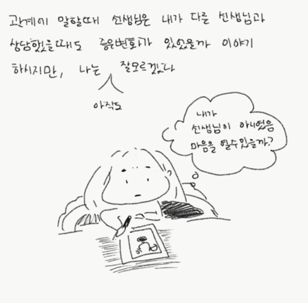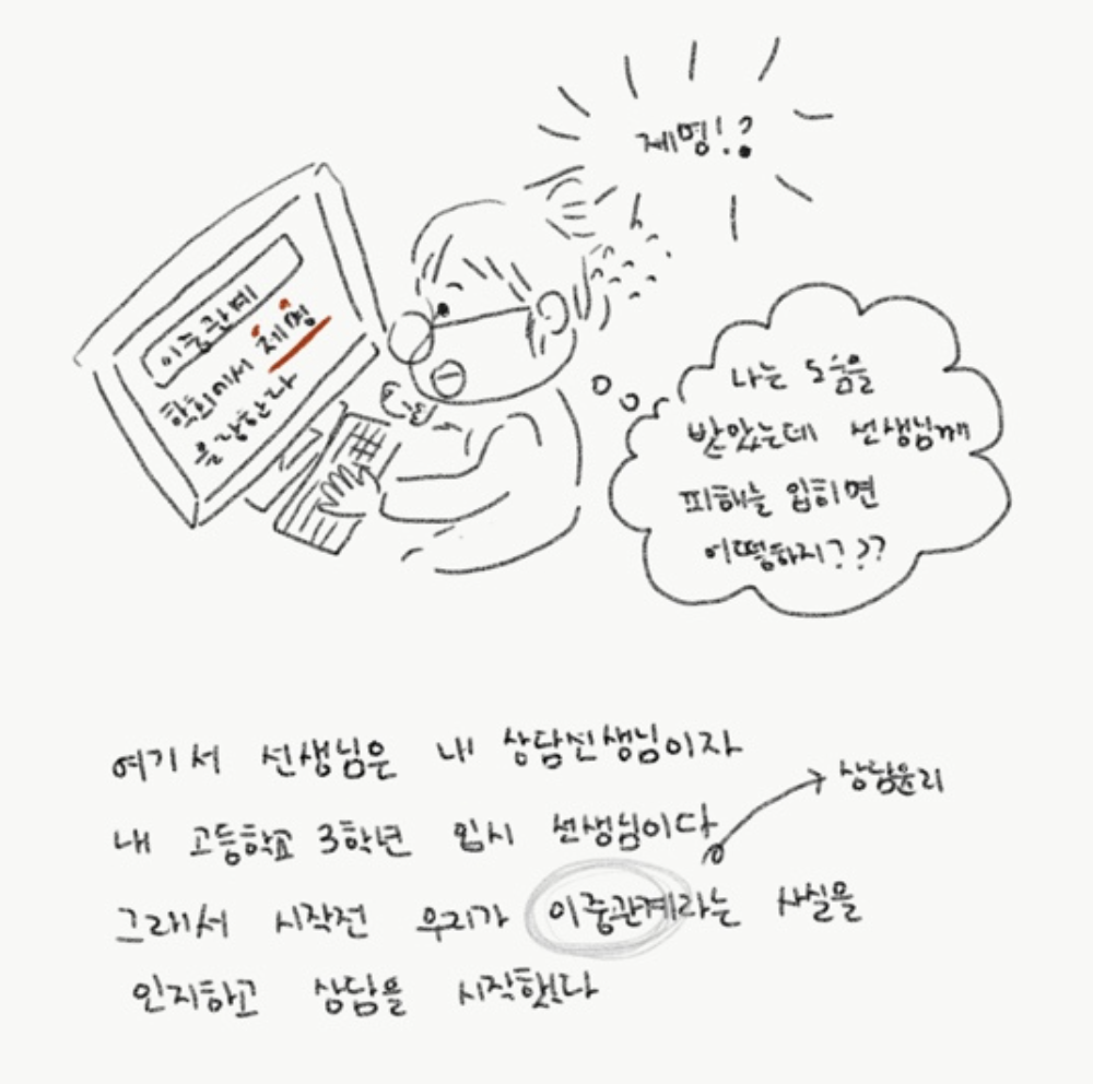 나의 경우 이중관계를 협의 후 상담을 시작했다. 내 생각에 선생님이 아니었다면 마음을 열지 못했을 것이라는 생각도 있지만, 처음 만났던 선생님이 전부가 아니라는 걸 알았다면, 내 인생은 조금이라도 바뀌었을지 그것은 모르겠다.