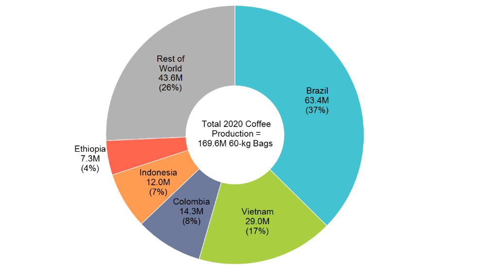 아쉽게도(?) 로부스타 생산량 1위는 베트남이 전체 로부스타의 40%이상으로 압도적으로 많다.