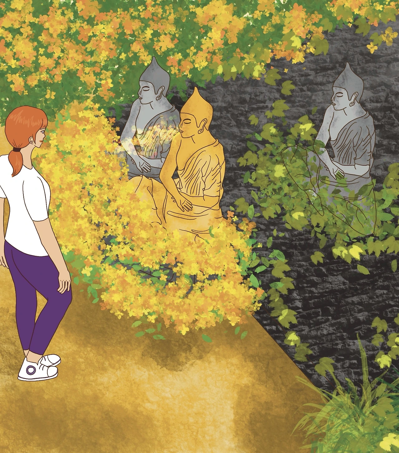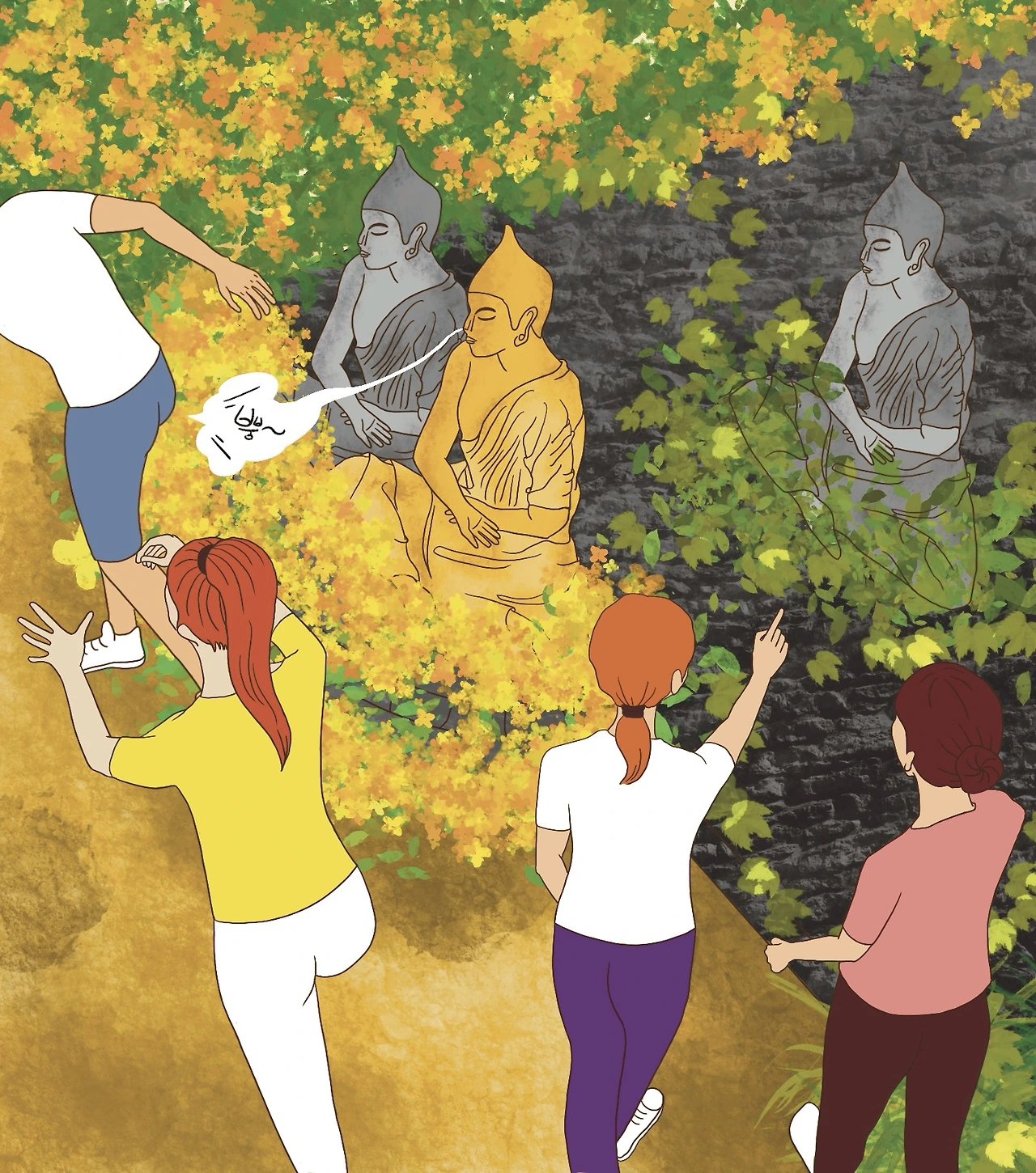 그곳엔 뾰족한 모자를 쓴 황금불상이 서 있었고, 그 옆에는 평범한 돌부처들이 나란히 놓여 있었다.