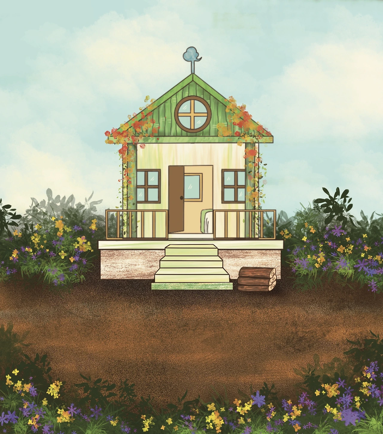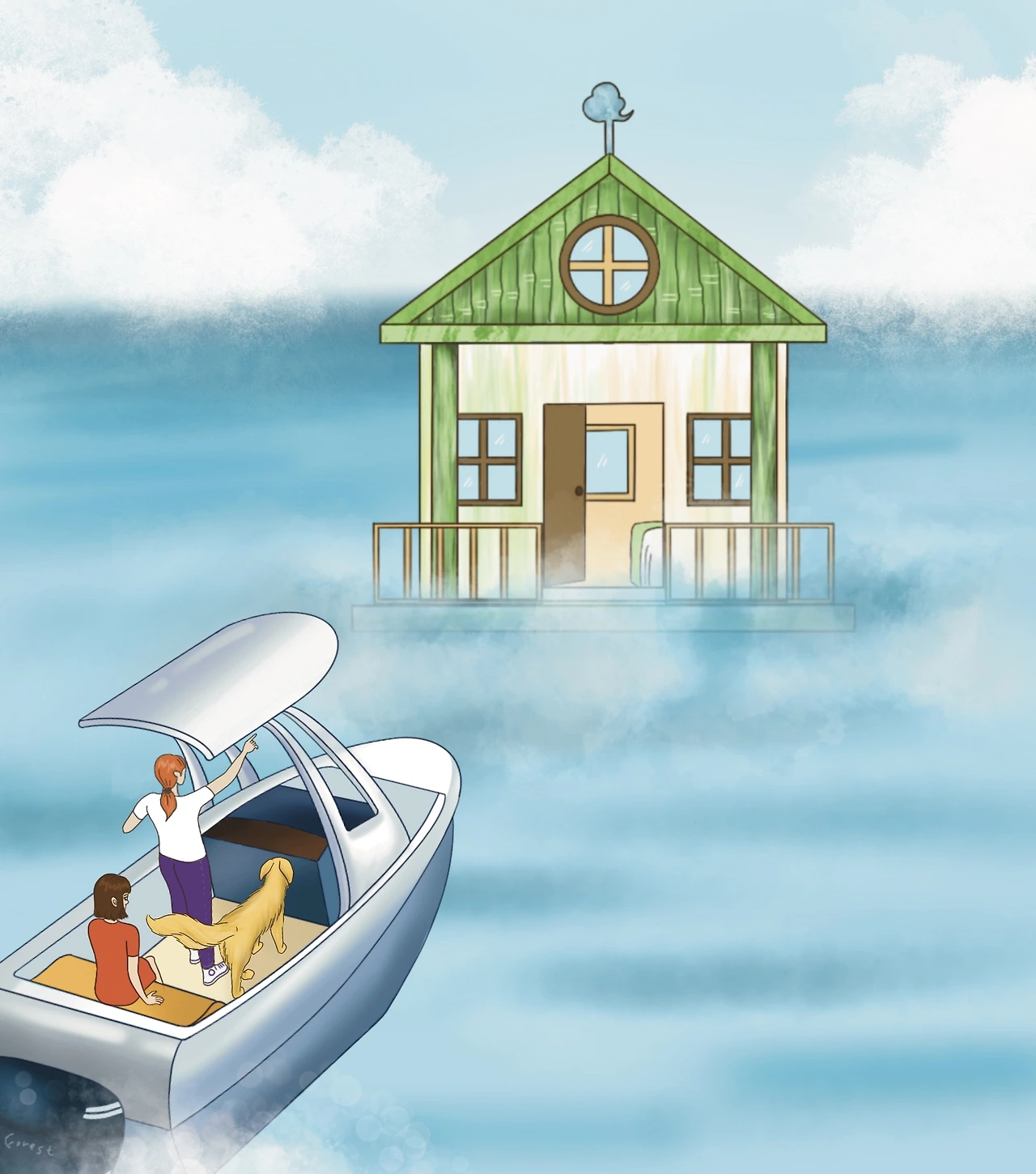 집은 작고 아담했으며, 자연이 직접 꾸민 듯 벽과 처마 사이로 풀과 꽃들이 자라나고 있었다. 홍수로 물이 가득 찬 섬 가운데, 유일하게 잠기지 않은 그 집은 마치 물 위에 떠 있는 듯 보였다.