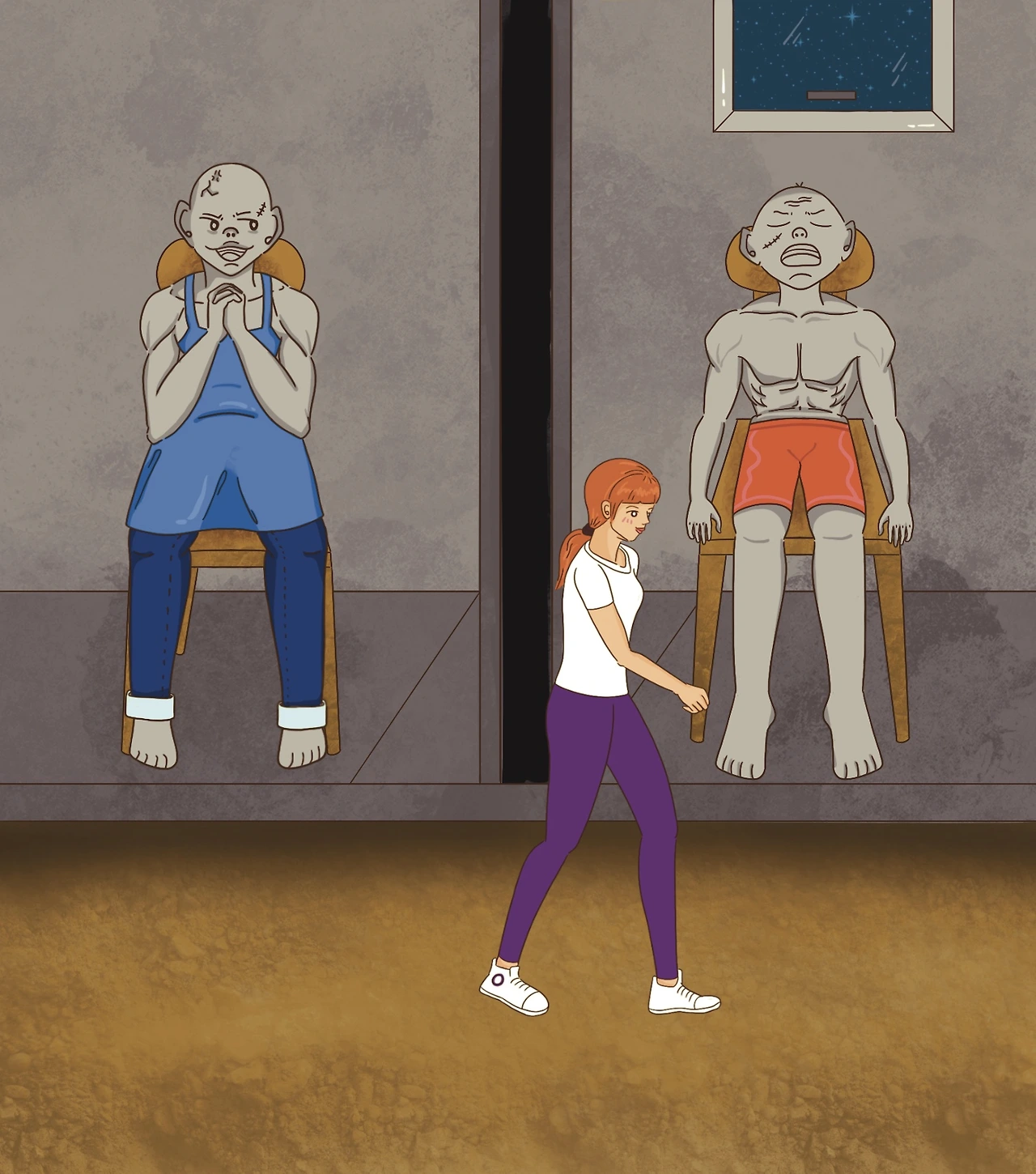 찰나, 그녀가 무심코 지나쳤던 첫 번째 컨테이너 속 장면이 머릿속을 빠르게 스쳐 지나갔다. 마치, 그녀의 시각과 움직임을 따라오지 못한 뇌의 지각처럼... 분명, 어둠 속에 앉아 있던 한 남자. 그는 날카롭고 커다란 눈으로, 확실하게 그녀의 걸음에 맞춰 동공을 움직였고, 괴수의 입가엔, 마치 먹잇감을 포착한 짐승처럼 섬뜩한 웃음이 서려있었다.