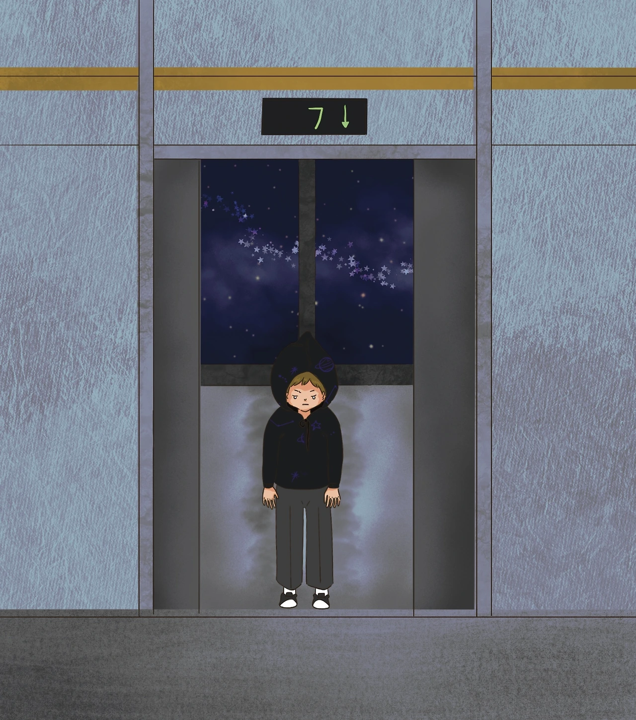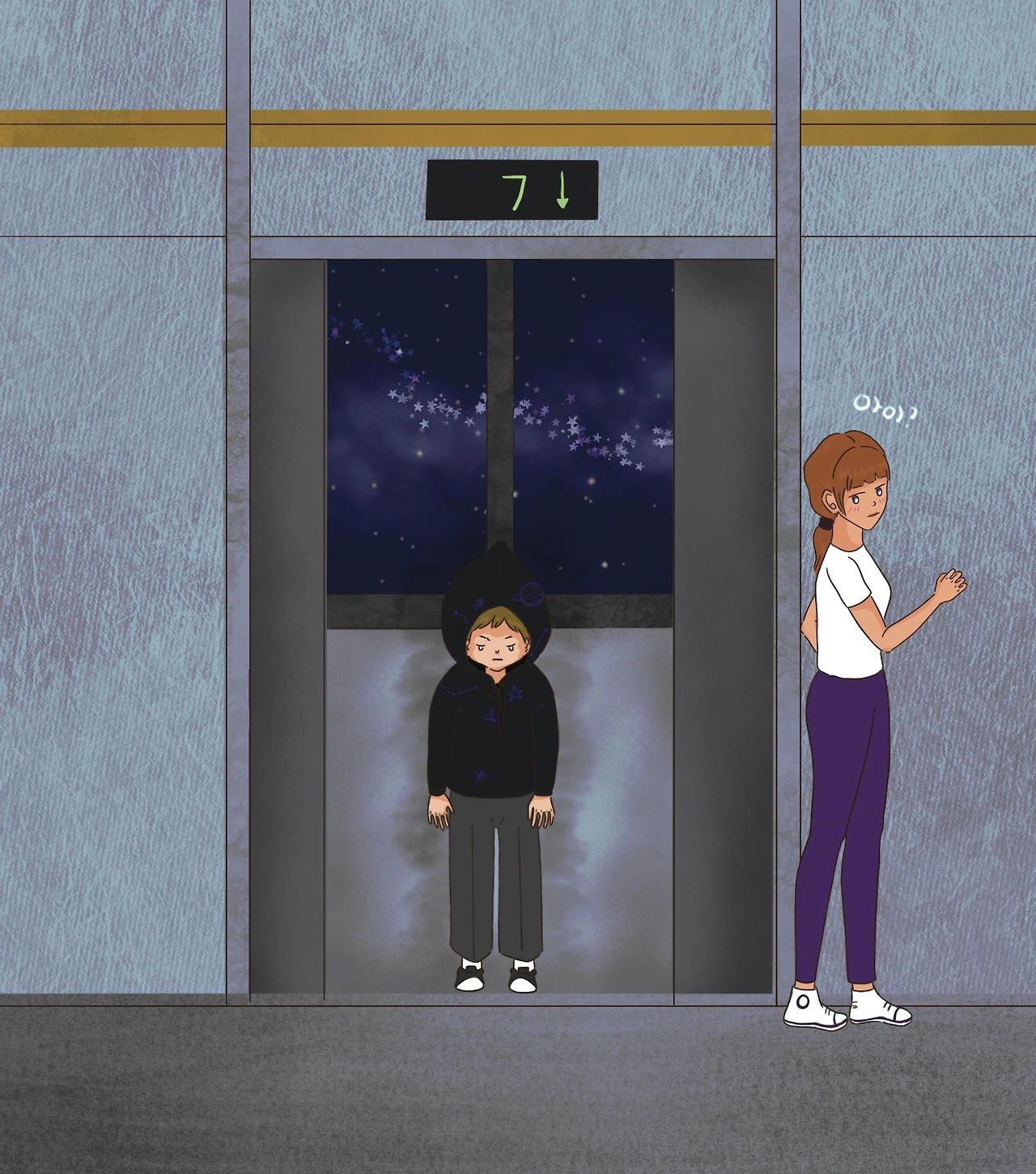 경계와 의문을 품은 채, 루미나는 그의 손짓을 따라 나선 계단을 지나 옥상으로 향했다. 그때 문득, 그녀를 스쳐 지나던 검은 후드티를 입은 작은 아이가 떠올랐다.