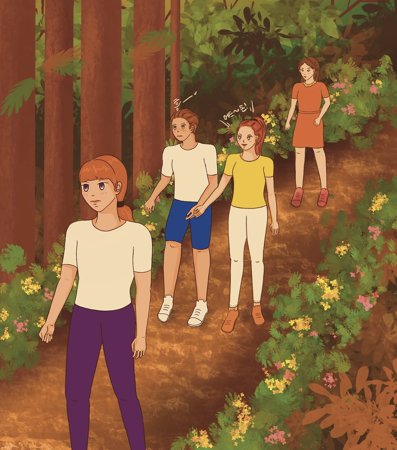 숲 속을 걷던 중, 갑작스레 언성을 높이는 남녀의 목소리가 들려왔다. 부부로 보이는 남성과 여성, 그들의 뒤를 또 다른 여성이 졸졸 따라오고 있었다.
