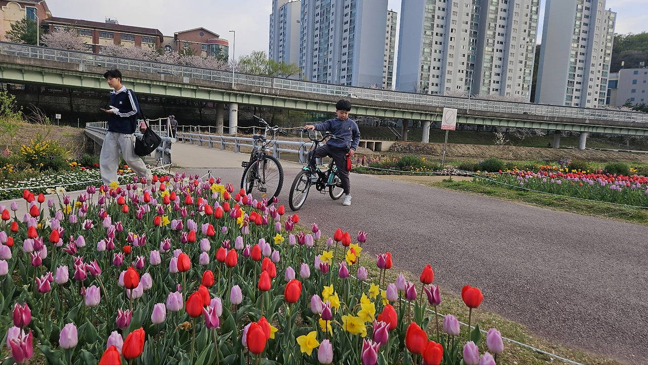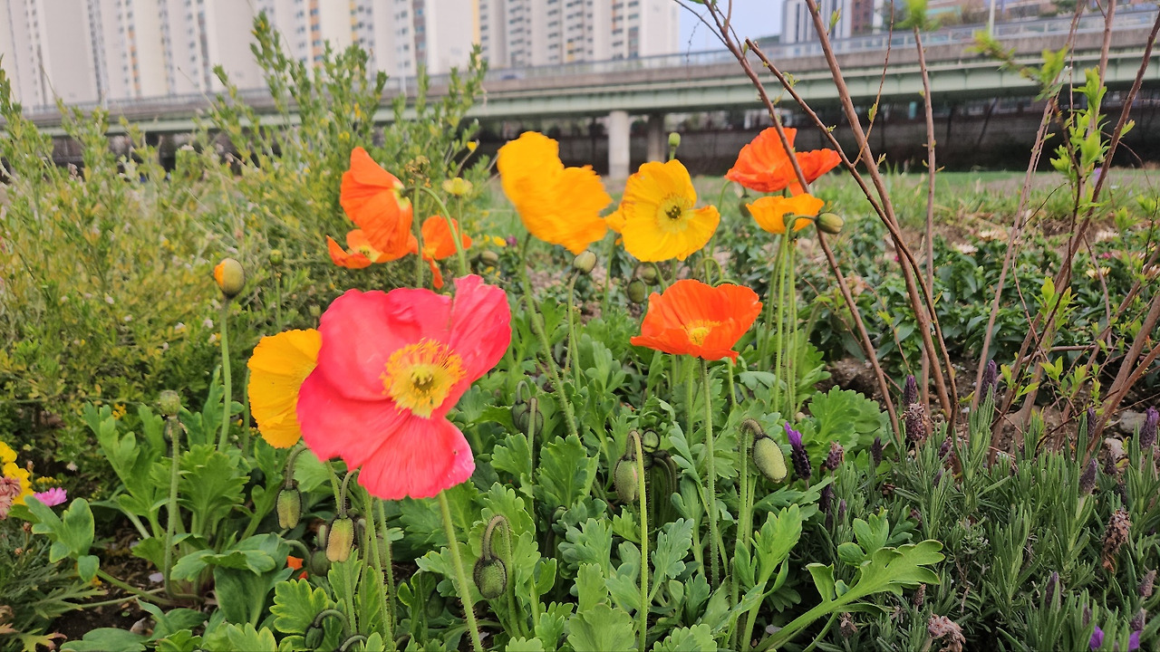나는 아이와 자전거를 세우고 꽃들을 하나하나 보기 시작했다. 하얀, 빨강, 보라, 핑크 튤립이 나를 설레게했다. 오므리고 있어 더 애가 탄다. 꽃들은 이름을 외워두고 이듬해 아는 척해주고 싶지만 바로 까먹는다. 그래서 다시 이름이 뭔지를 찾아보게 된다. 봄바람이 코끝에 닿아 시원하면서도 설명하기 어려운 그윽한 봄향기가 들어온다. 아이와 나는 서로 아무런 대화없이 꽃을 바라보았다. 그러다 내 눈에 들어온 개양귀비. 매혹적인 색을 뿜으며 봄바람에 온몸을 살랑살랑 흔드는 것이 애교섞인 여인을 바라보는 남정네의 설렘같은 거랄까