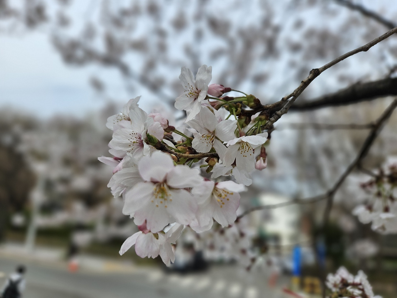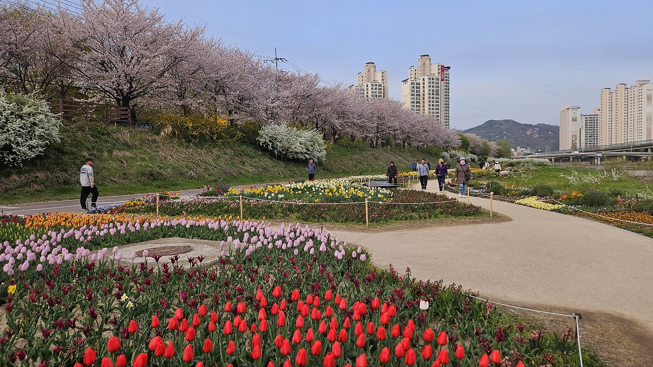 벚꽃이 한창이던 지난주에는 이른 저녁을 먹고 6시반부터 안양천에 자전거를 타고 나섰다. 늘 그렇든 안양천 충훈부길은 4월 둘째주에 환상적인 벚꽃로드가 펼쳐진다. 형형색색의 LED조명이 시간간격을 두고 바뀌니 하아얀 벚들이 묘한 색으로 비췬다. 4월에 부는 바람을 만끽하고 싶어서 자전거를 탔다. 차지도 않고 덥지도 않는 이 바람은 움츠렀던 3월까지 언제 추위가 끝나냐며 기다렸던 내 마음에 설렘을 안고 온다. 더욱이 벚꽃은 꼭 비와 함께 떨어지는데 4월의 변화무쌍한 날씨가 요란한 가운데 주초반에는 만개한 벚꽃과 함께 눈이 펑펑 내려서 밤운전 중에 벚꽃과 눈을 함께 감상하는 경이로운 현상을 온몸으로 맞이했다. 아파트를 나와 안양천으로 가는 오솔길을 자전거로 5분 정도 달리면 넓게 펼쳐지는 긴 코스의 벚꽃길이 펼쳐진다. 이곳은 다양한 꽃들을 심어놔서 그냥 지나칠수가 없다.