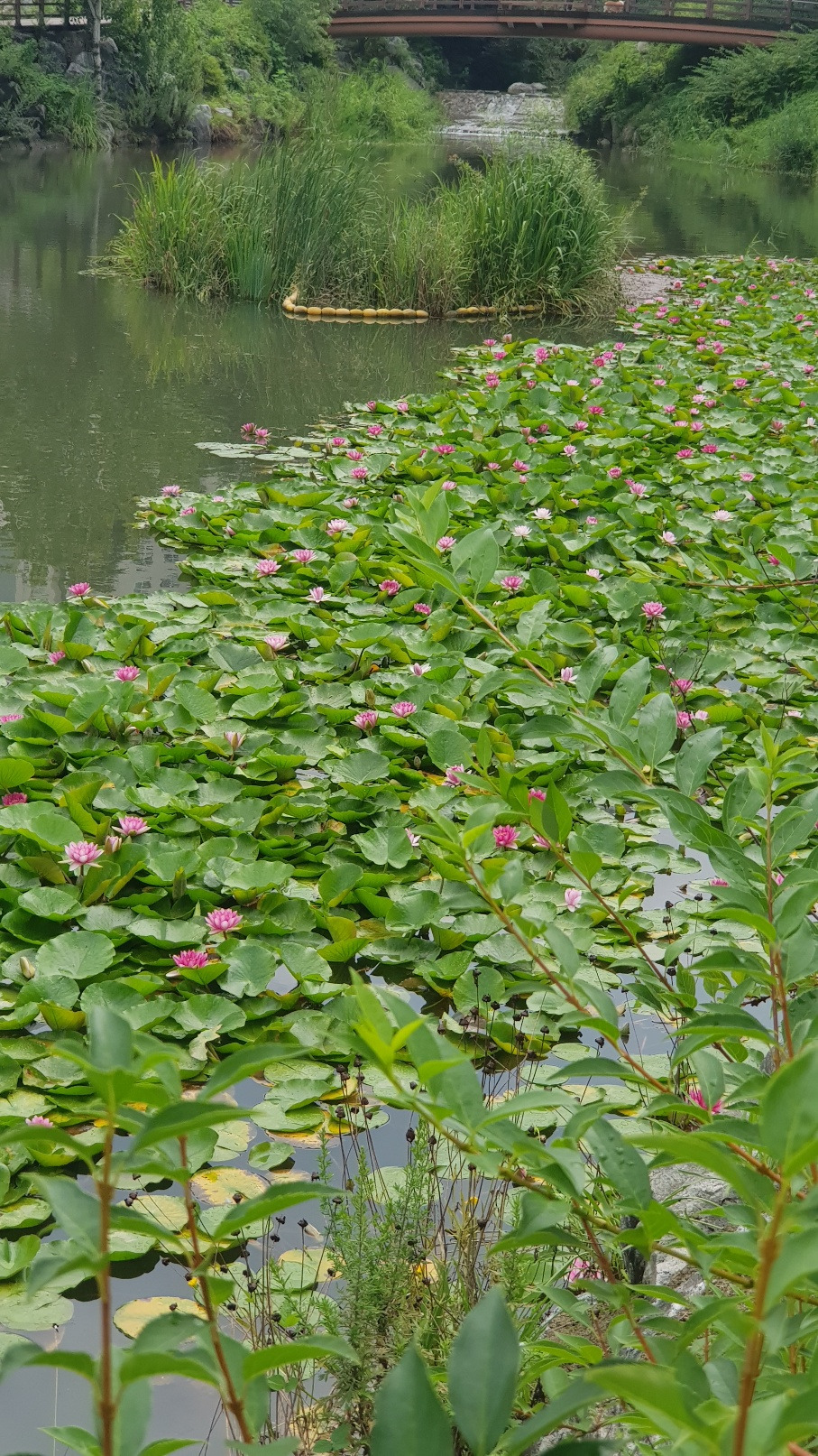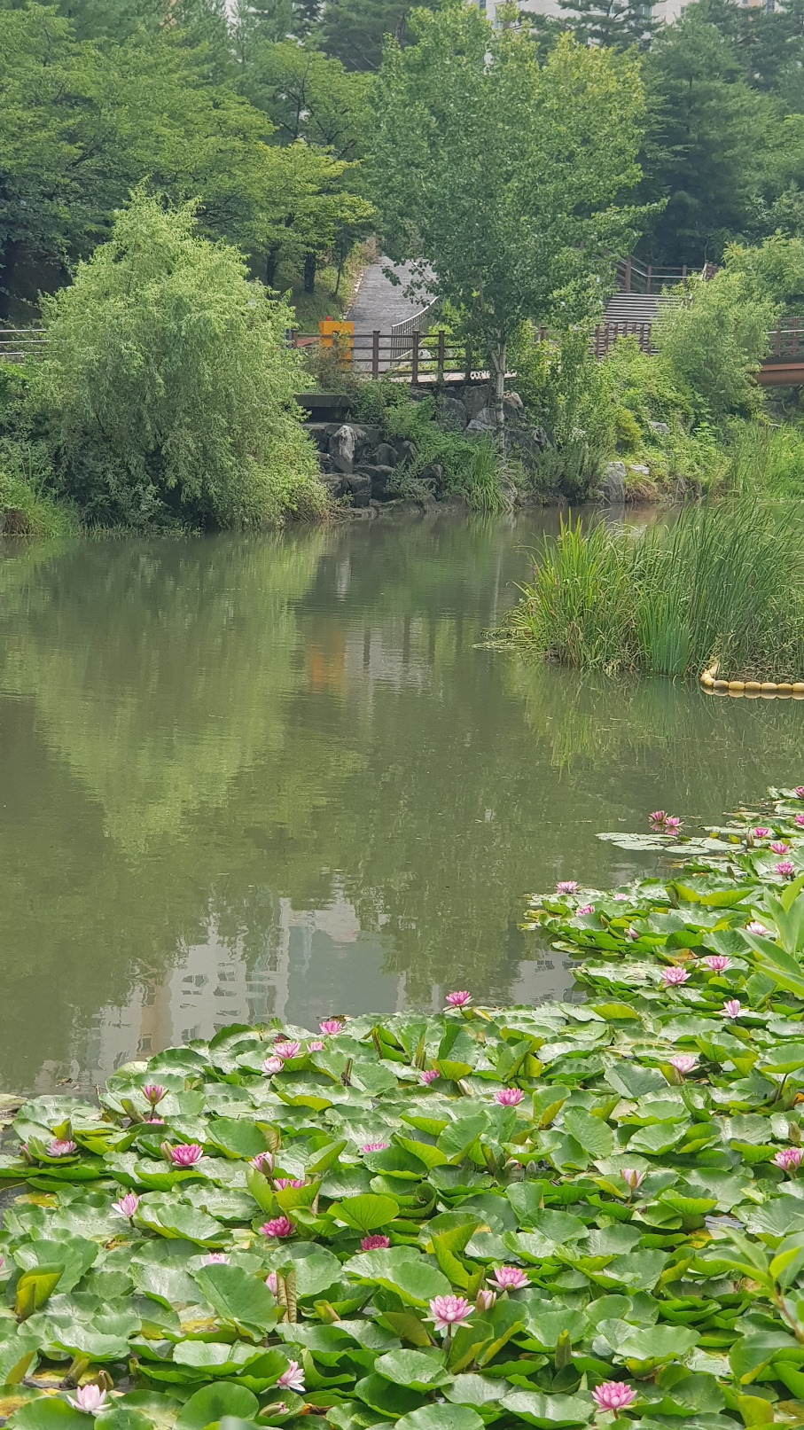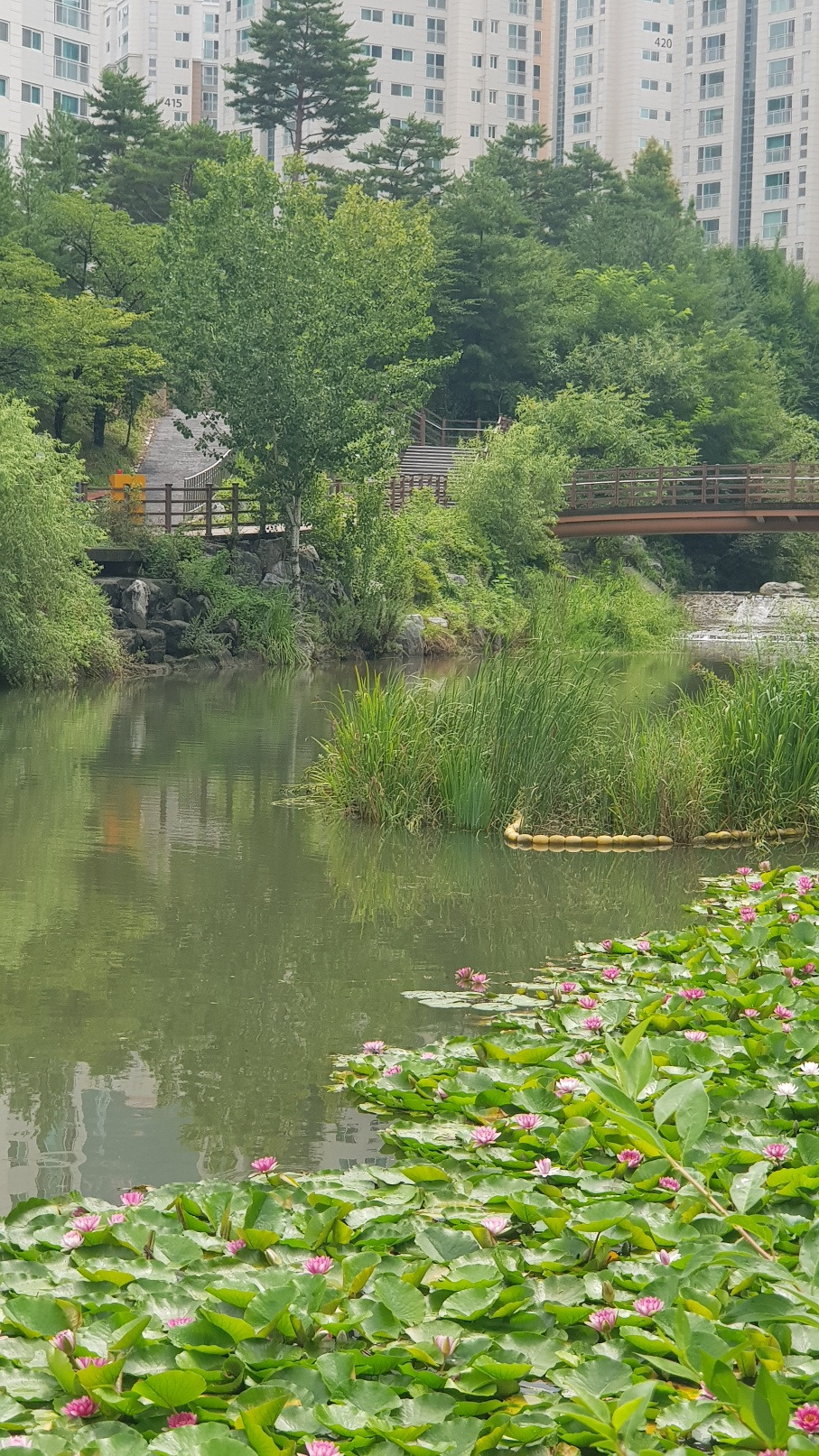 오늘 아침 운동 중에 은평뉴타운 폭포동 인공폭포 앞의 저수지에 활짝 핀 수련을 만났습니다. 아침저녁으로 조깅하거나 걷기 운동할 때 늘 이곳을 지나다니면서도 보지 못했는데 오늘 활짝 핀 연꽃이 눈에 띄네요.
