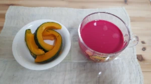 아침식사 대용 호박 & 당근 사과 비트를 갈아 만든 야채주스와 혈압기