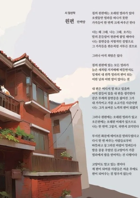 한백양의 시 「왼편」은 2024년 동아일보 신춘문예 당선작으로서 ‘집의 왼편’이라는 공간적 설정을 통해 현실의 복잡하고 다정다감한 감정을 담아낸 작품으로서, 일상생활에서 느낄 수 있는 인간관계와 삶의 애환을 담백하면서도 깊이 있게 시적 울림으로 끌어올린 작품입니다. 이 시는 표면적으로는 낡고 오래된 빌라와 그 속에서 벌어지는 일상적 갈등을 다루고 있지만, 그 이면에는 우리 사회의 이념적 갈등과 편 가르기를 풍자한 깊은 메시지가 숨어 있습니다.