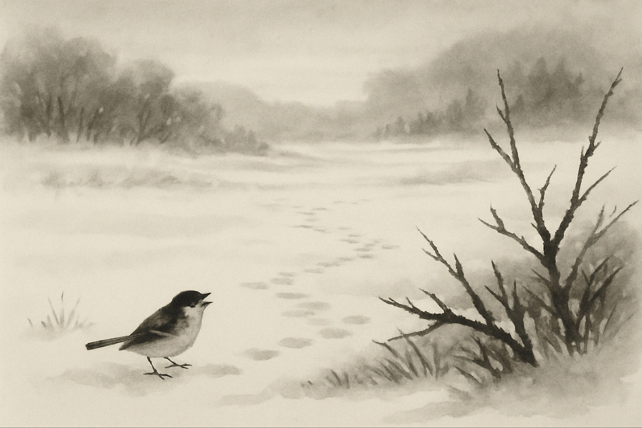 “붓 대신 소리로 획을 긋는다”라는 표현은 인간의 도구인 붓이 아닌 자연의 소리(새소리)로 시를 ‘쓰는’ 행위이다. 이는 눈밭이라는 비어 있는 공간 위에 단순히 ‘소리’라는 존재감을 묘사한 것이 아니라, 시인의 존재론적 고백으로 읽을 수 있다. 인간의 도구로는 더 이상 충분하지 않은 예술의 한계 앞에서, 시인은 자연의 감각, 존재의 울림을 빌려 시를 쓰려는 의도로 읽을 수 있다.