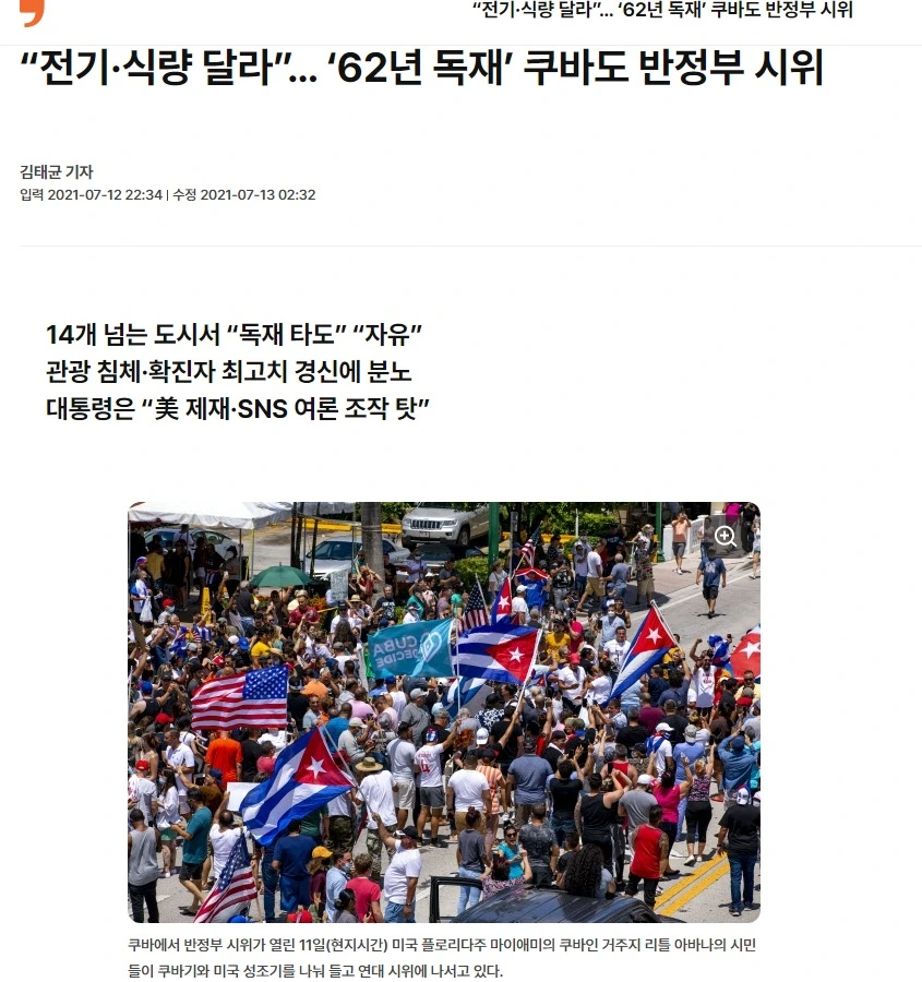 이와 같이 미국식 자유주의에 가스라이팅 당한 한국의 기사들은 리비아 카다피 때, 어떠한 결과가 초래됐는지를 전혀 보지 않는다는 사실을 잘 보여주고 있다. 그냥 미국이 지원하고 후원하면 전부다 민주화 시위고 유로마이단처럼 반데라주의자 네오나치들이 주류로 암약해도 일단 ‘민주주의’ 시위가 되는 기적의 논리가 펼쳐지는 것이다. 레짐 체인지(regime change)를 동반한 미국의 색깔 혁명 공작이 이렇게 타국의 주권과 역사 그리고 문화와 정치를 지극히 미국 중심으로 왜곡하고 있다. 거기다 당시 쿠바 반정부 시위는 규모가 수백 명 수준이었고, 맞불집회는 수천수만 명이 했지만, 국내 언론은 그런 맥락을 전부다 생략했다. 이것이 바로 미국식 친서방주의가 민중들을 ‘민주화’라는 단어로 집단 망각하게 만들고 있음을 보여준다.