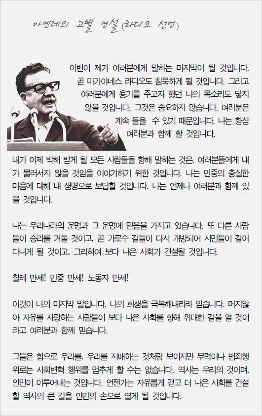 “노동자와 농민과 지식인 모두, 앞으로 파시즘 치하에서 탄압을 당하게 될 겁니다. 파시즘은 이미 현실로 나타나고 있습니다. 테러가 횡행하고, 교량이 파괴되고, 철로가 끊기고, 원유와 가스 파이프라인이 파괴돼도 이를 막아야 할 자들이 아무런 행동도 하지 않았습니다. 저들 역시 똑같은 짓을 저지른 겁니다. 역사가 저들을 심판할 것입니다. 인민 여러분, 스스로를 보호해야 합니다. 하지만 절대 희생돼선 안 됩니다. 저들에게 압도당해서도, 살육을 당해서도 안 됩니다. 저들의 모욕을 참지도 말아주십시오. 조국의 노동자 여러분, 저는 칠레와 칠레의 운명에 대한 믿음이 있습니다. 반역이 우리에게 강요한 이 잿빛의 쓰디쓴 순간도, 누군가는 반드시 이겨낼 것입니다. 그 점을 잊지 말기 바랍니다. 그리 머지않은 장래에, 자유로운 인간이 더 나은 사회를 건설하기 위해 당당하게 걸어갈 드넓은 길을 열어나갈 수 있을 것입니다. 칠레 만세! 인민 만세! 노동자 만세! 이것이 제가 여러분께 드리는 마지막 말입니다. 제 희생이 헛되지 않을 거라고 확신합니다. 적어도 제 희생을 통해 범죄자와 비겁한 자, 반역자는 반드시 처벌받아야 한다는 도덕적 교훈을 얻게 될 것입니다.”