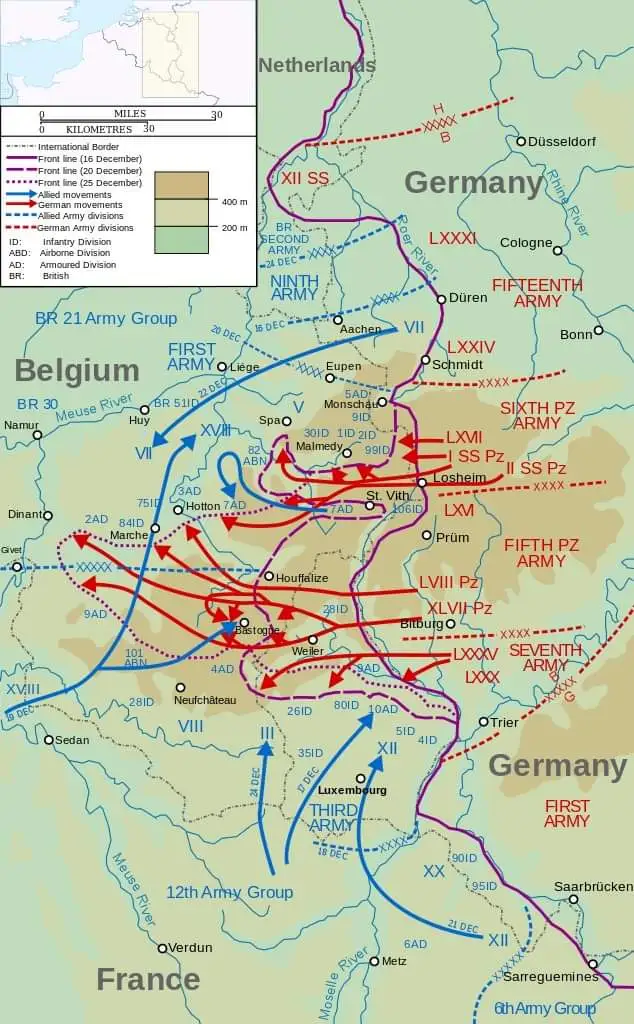 1944년 12월 25일 크리스마스를 전후로 패튼 장군의 미군 기갑사단이 대량으로 진격하면서 만토이펠이 이끈 전차부대들이 분쇄됐다. 영국의 군사사학자 존 키건에 따르면, 12월 26일 아이젠하워 사령부는 항공부대를 개입시켰고, 패튼의 기갑사단을 투입하여 바스토뉴에 포위된 제101 공수사단을 구출했다. 그리고 그날 독일 기갑사단의 선두 전차들을 박살 냈는데, 독일 기갑병력은 이날 미군과의 교전에서 전차 88대와 돌격포 28대를 잃었다. 사실 이 당시 독일군은 최신 전차인 6호 전차를 투입했는데, 이게 바로 티거라 불리는 신형전차였다. 놀랍게도 이 전차는 미군의 주력 전차인 M4 셔먼보다 훨씬 파괴력 및 성능이 좋았으며, 영국군의 마틸다나 크롬웰 그리고 크루세이더 보다도 당연히 훨씬 좋았다. 즉, 전차에 있어서 독일이 미국과 영국보다 더 앞섰던 것이다.