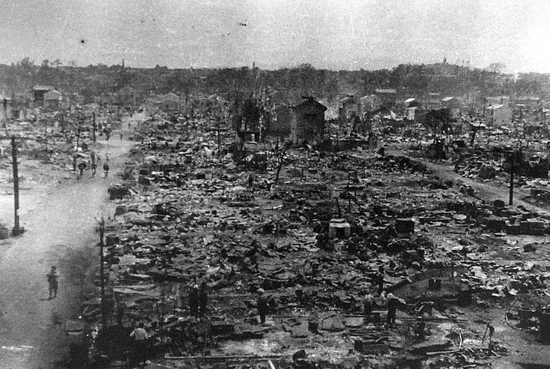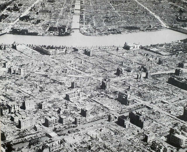 상공에서 찍은 도쿄 상공의 모습: 폭격으로 수많은 건물들이 파괴되었음을 확인할 수 있다.