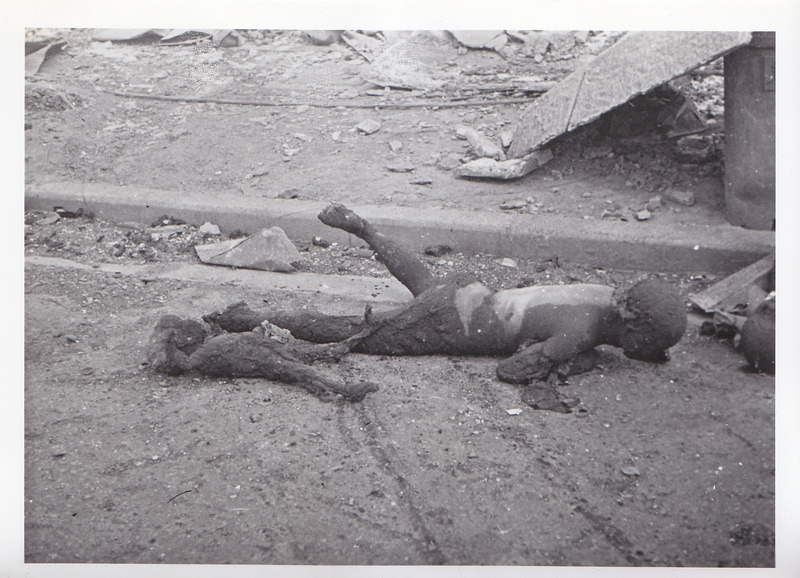 소이탄 공격으로 불에 탄 민간인 시체: 죽은 사람은 엄마와 아이로 보인다.