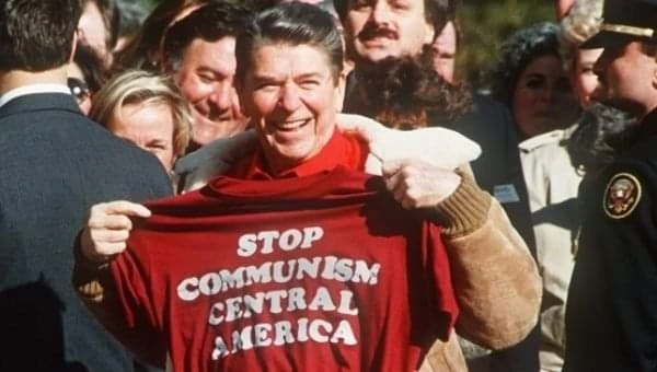 라틴아메리카에서는 공산주의는 안된다는 티셔츠를 든 미국의 로널드 레이건 대통령