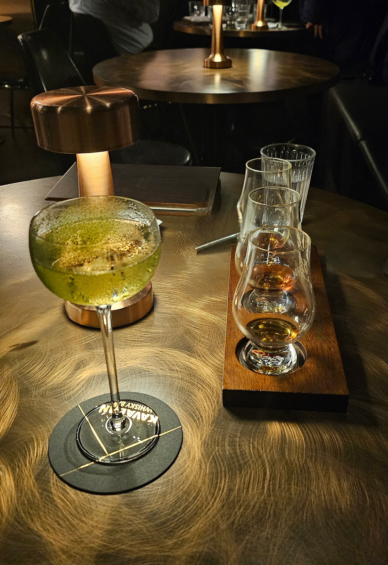여기서부터 남자의 경험담으로 후기를 대신하겠다. 카발란 위스키가 들어간 칵테일과 샘플러 키트를 마셨다. 먼저, 달지 않고 도수가 제법 있는 시그니처 칵테일을 추천받았다. 차 추출물과 카발라 위스키를 사용해서 쌉쌀하고 깔끔해 천천히 음미하며 마시기 좋았다.