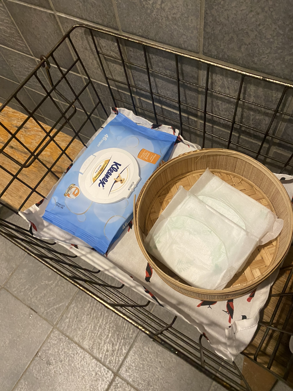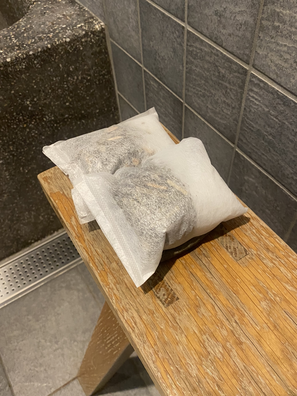 돌로 만들어진 욕조에서 목욕할 경우를 대비해 약초와 소금이 들어간 천연입욕제가 있었다. 그리고 혹시 모를 경우를 대비해 여성용품과 물티슈 또한 구비되어 있어 디테일에 신경을 많이 쓴 느낌을 받았다.