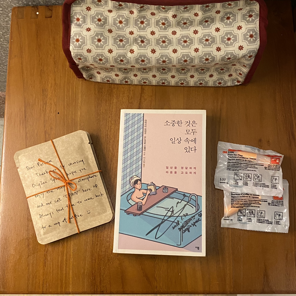 침대 옆 탁상에는 1층 카페에서 만든 드립백과 한국어로 된 에세이, 귀마개가 준비되어 있었다. 조용한 분위기에서 오로지 자신에게 집중할 수 있는 시간과 공간을 제공한 오리진 스페이스에 감사함을 표한다. 오래된 건물이라 방음이 잘 안 된다는 후기가 있었지만 새벽 시간에 입실한 우리 커플은 불편함을 느끼지 못했다. 오히려 숙면을 취해 퇴실 시간을 못 맞출 뻔 했다.