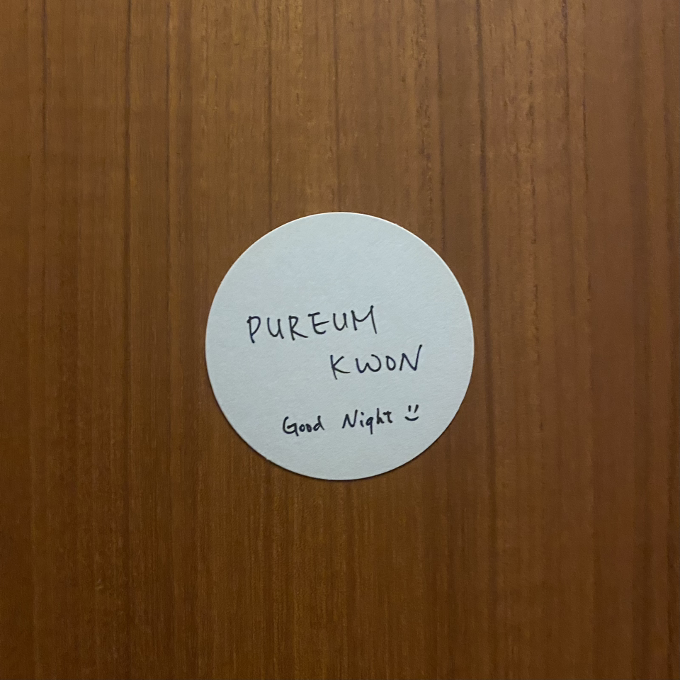 도착해서 들어가려고 하는데 문에 스티커가 붙여져 있다고 그가 알려주었다. 스티커엔 내가 머무를 방임을 알려주었고 잘 자라고 인사해 줬다. 찍어낸 글자가 아닌 손글씨가 주는 감성이 코끝을 간지럽혔다.