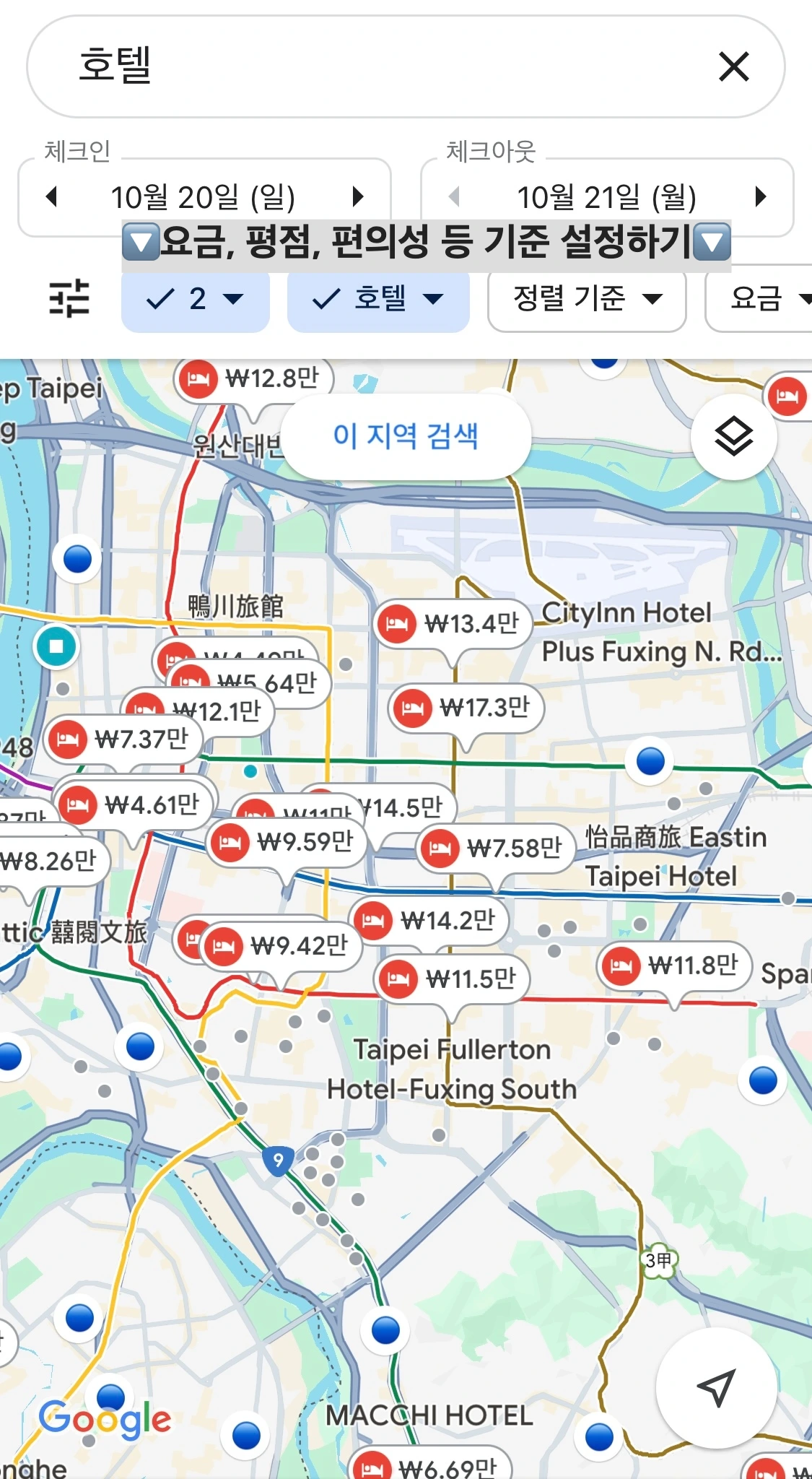 우선, 구글 지도에 방문할 곳을 저장한 뒤 경로가 어떻게 되는지 파악한다. 머물고 싶은 곳의 위치를 확대한 후 상단에 있는 호텔 버튼을 누르면 근처에 있는 모든 호텔이 조회된다.