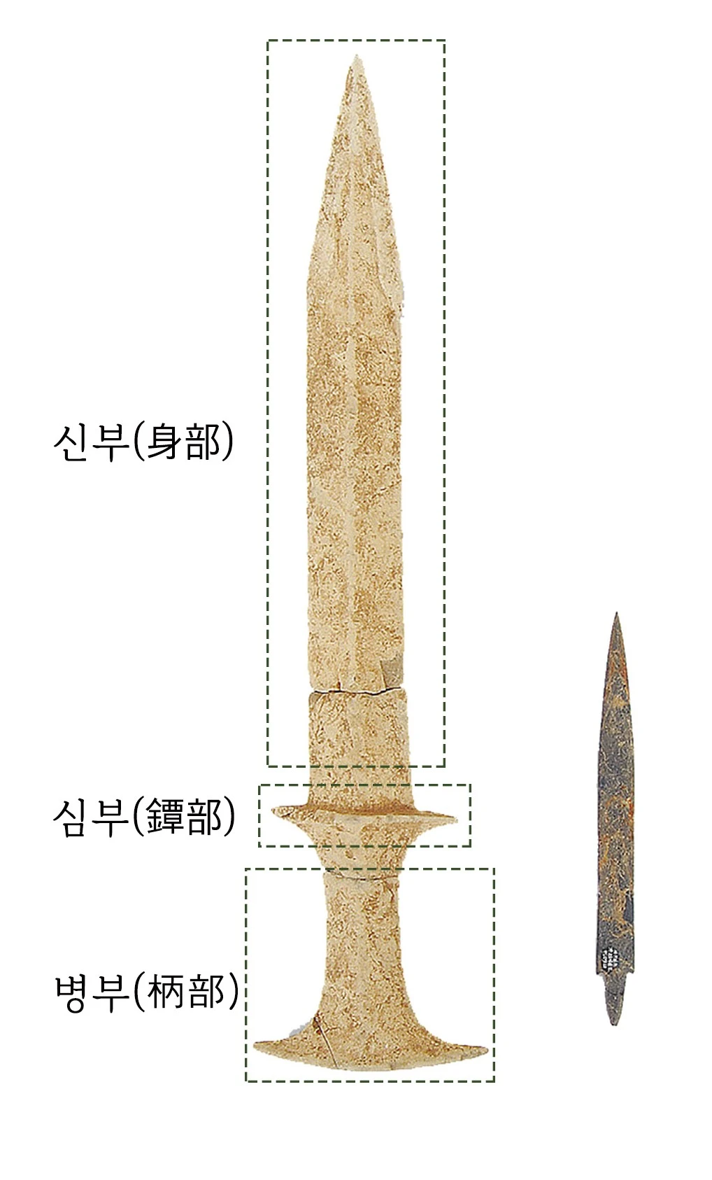 해당 석관묘에서는 석검(石劍)과 석촉(石鏃) 1점이 출토되었습니다. 석검은 무덤 벽면의 충전토(充塡土) 위에서 신부(身部), 심부(鐔部), 병부(柄部)의 3부분으로 파쇄되어 겹쳐져 부장되었습니다. 이를 통해 유물을 의도적으로 부러트린 다음 부장하는 ‘유물훼기’ 의례의 가능성을 엿볼 수 있습니다. 석검과 함께 부장된 석촉 역시 무덤에서만 출토되는 부장용(副葬用) 석촉으로, 청동기시대에 실용으로 사용되던 일반적인 석촉보다 길이가 훨씬 길고 얇아 부러지기 쉬우며 섬세하게 제작된 것을 볼 수 있습니다.