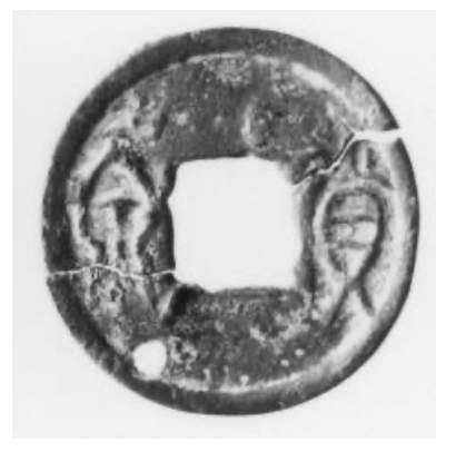 해안가(주거지나 패총)를 중심으로 확인되는 화폐의 경우는 어떠할까요? 제주도 산지항 등에서 확인되는 화폐 중에서는 글자 옆에 원형의 구멍을 뚫은 사례가 확인됩니다(이청규・강창화, 1994).