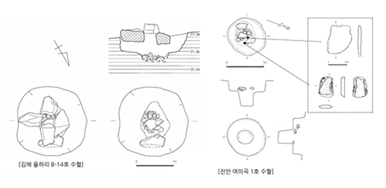 가령 이 두 수혈은 (1) 김해 율하리 B-14호 수혈 (2) 진안 여의곡 1호 수혈 입니다. 이들에 대해서는 다른 수혈들과 조금 다른 해석이 이루어지고 있는데요. 그 근거로는 크게 네 가지가 있습니다.