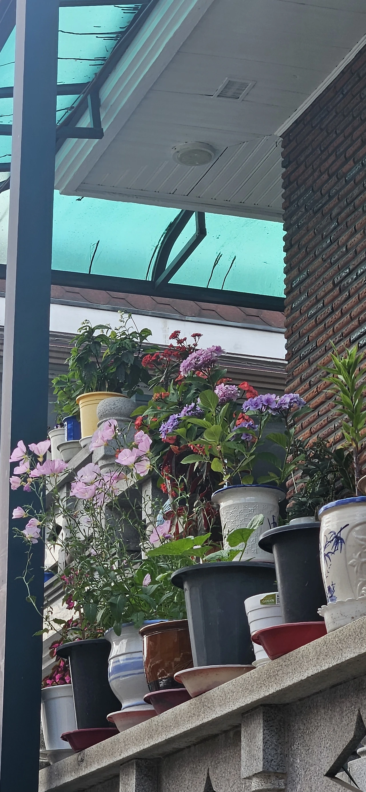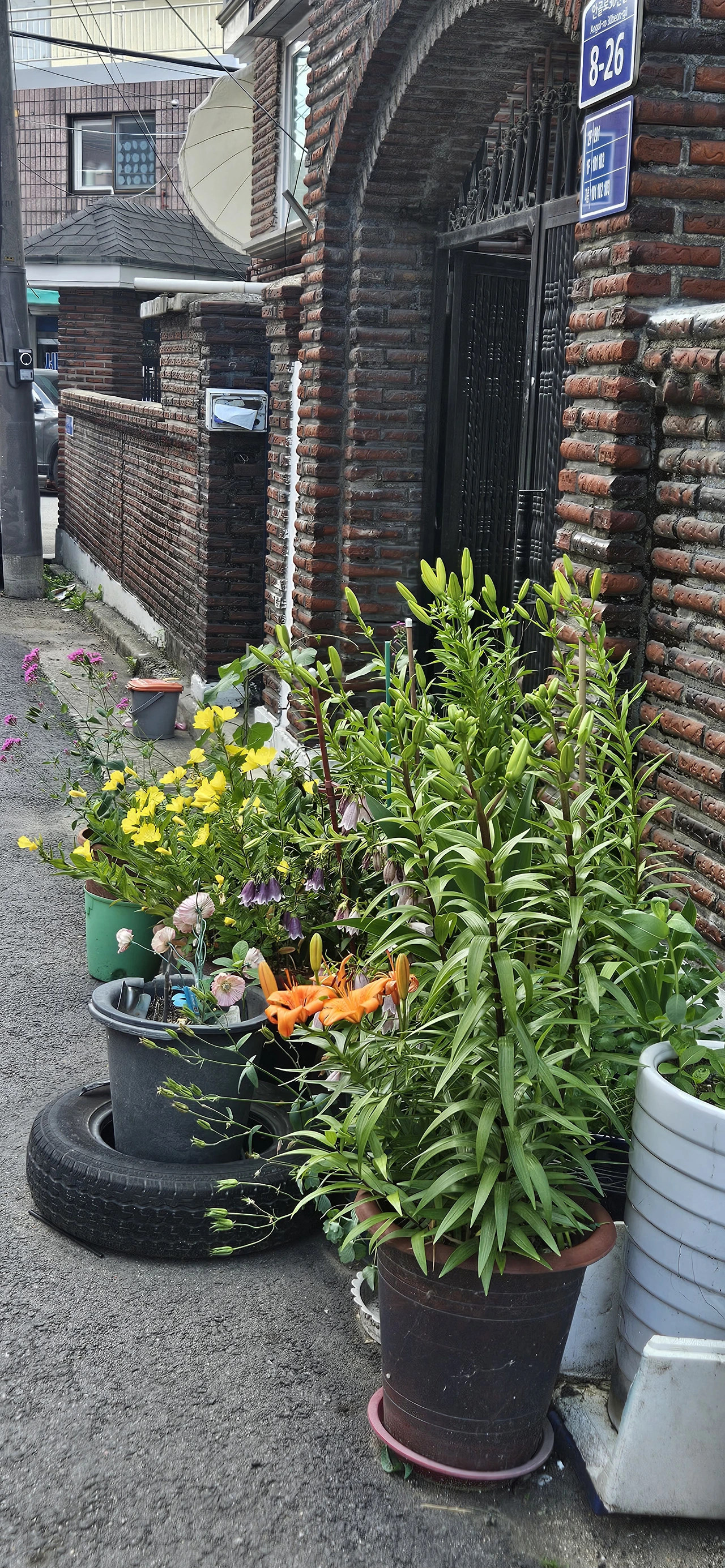 각자의 개성으로 꽃과 키 크고 작은 나무가 담장에서 지나가는 사람들을 넘겨보는 것과