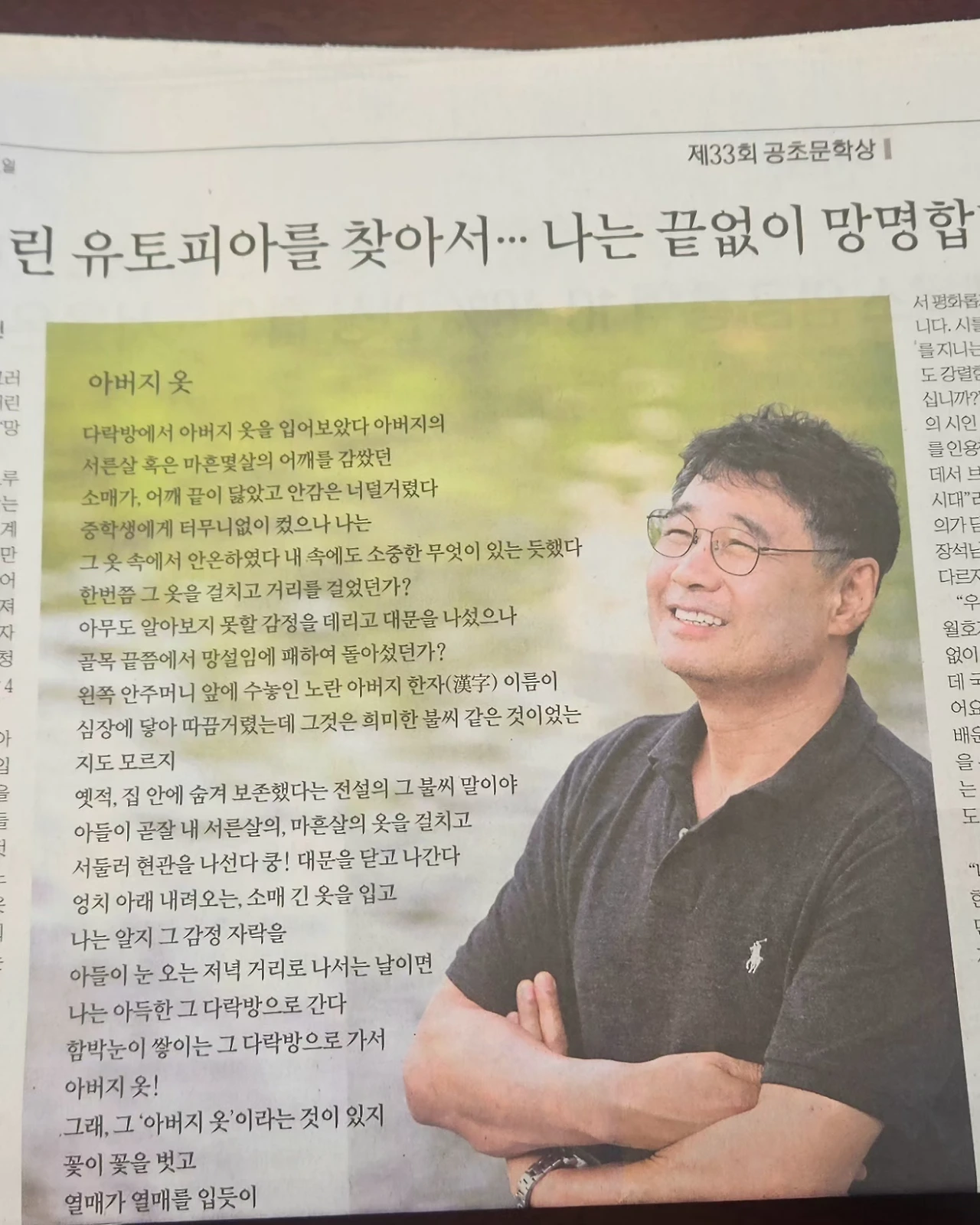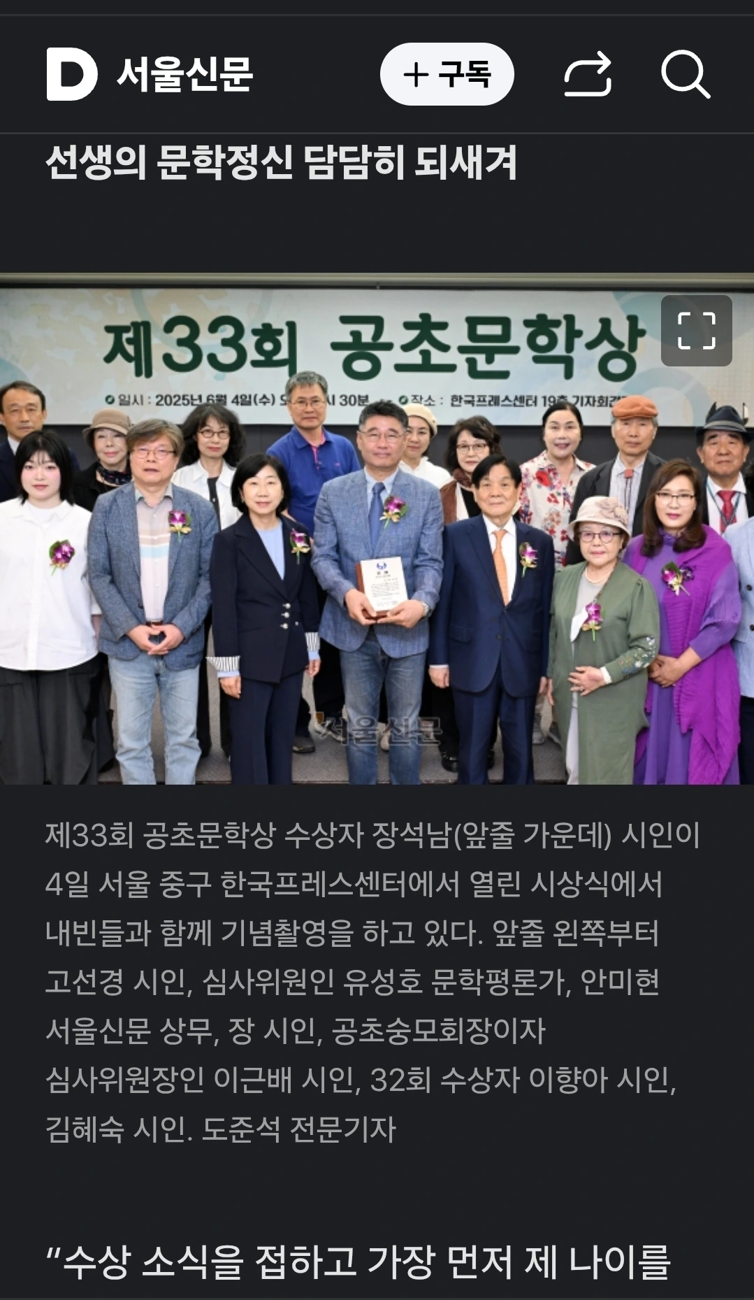 공초문학상 심사위원장인 이 시인은 “수상작 ‘아버지 옷’은 뛰어나게 아름다운 작품인 데다 시인을 넘어 구도자였던 공초 선생님의 정신과도 잘 맞닿아 있는 작품”이라고 평했다.
