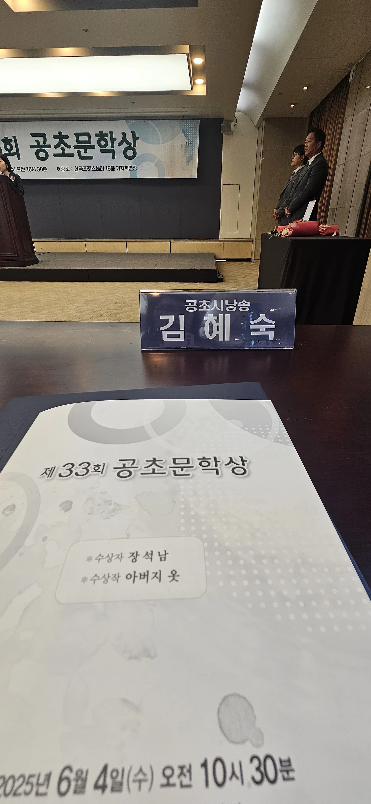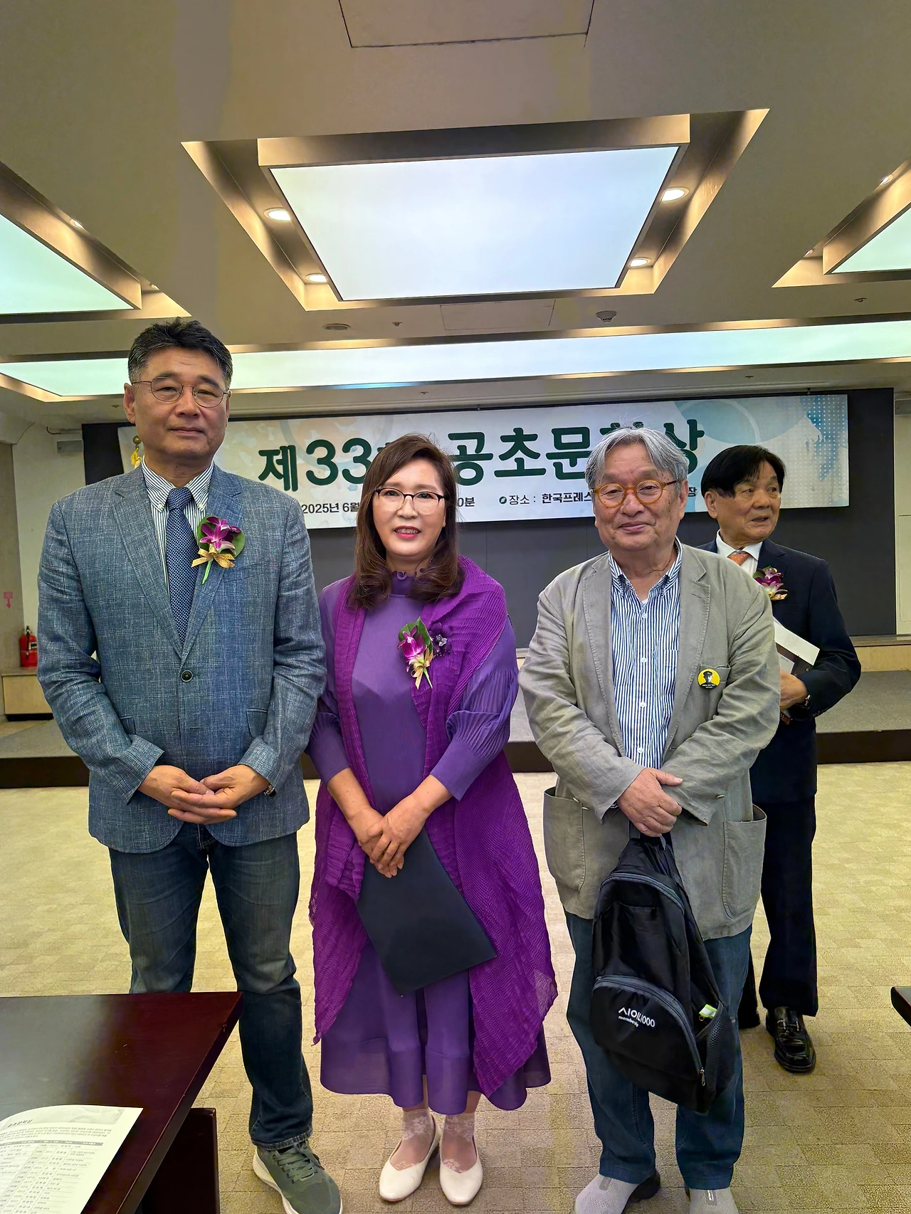 이날 시상식에는 공초숭모회장인 이근배 시인과 문학평론가 유성호 한양대 국어국문학과 교수, 32회 수상자인 이향아 시인과 정끝별 시인(이화여대 국어국문학과 교수), 나희덕 시인(서울과학기술대 문예창작학과 교수) 등이 참석했다.