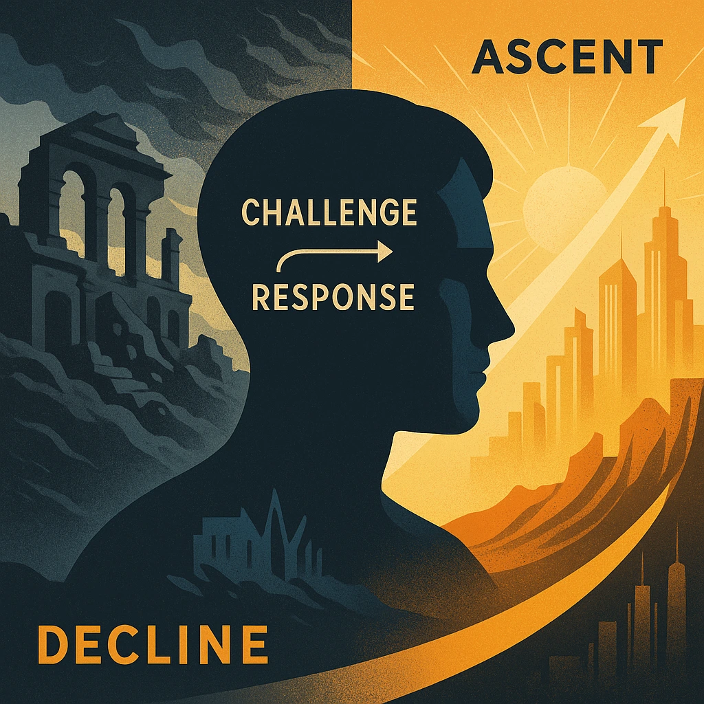 토인비의 핵심 역사관 중 하나는, 인류가 문명을 ‘의지적으로’ 구축한 것이 아니라, 각 민족이 정착하게 된 자연·지리적 환경을 극복하는 과정에서 문화와 기술, 기질, 제도가 형성되었다는 점이다. 문명은 거대한 의지의 산물이기보다, 환경이라는 거대한 조건에 대한 응답적 능동성(responsive agency)에서 생겨난다. 인간은 환경을 선택할 수 없지만, 그 환경이 던지는 도전에 어떻게 응답하느냐는 스스로 결정해 나간다는 것이다.