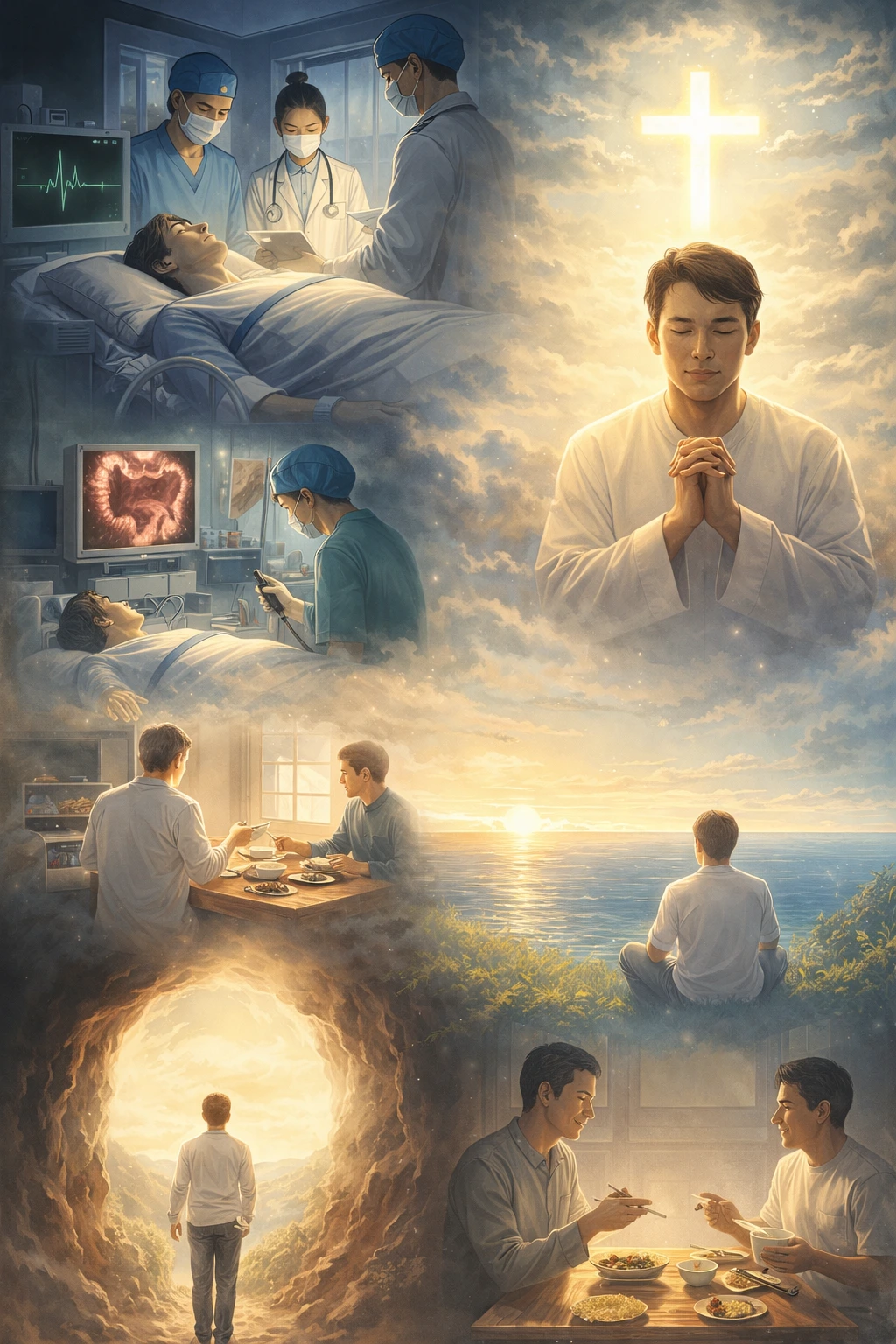 마취에서 깨어난 순간 나는 다시 현재로 돌아온다. 눈을 뜨면 여전히 이 세계가 있고, 여전히 나의 삶이 있다. 만약 죽음이 이와 비슷하다면, 그 다음 장면은 하나님이 준비하신 세계일 것이다. 그렇지 않다 해도, 적어도 이 체험은 나를 겸손하게 만든다. 내가 의식하지 못하는 시간 속에서도 생명은 이어진다는 사실, 그리고 그 생명을 맡기고 살아간다는 신앙의 의미를 다시 생각하게 한다.